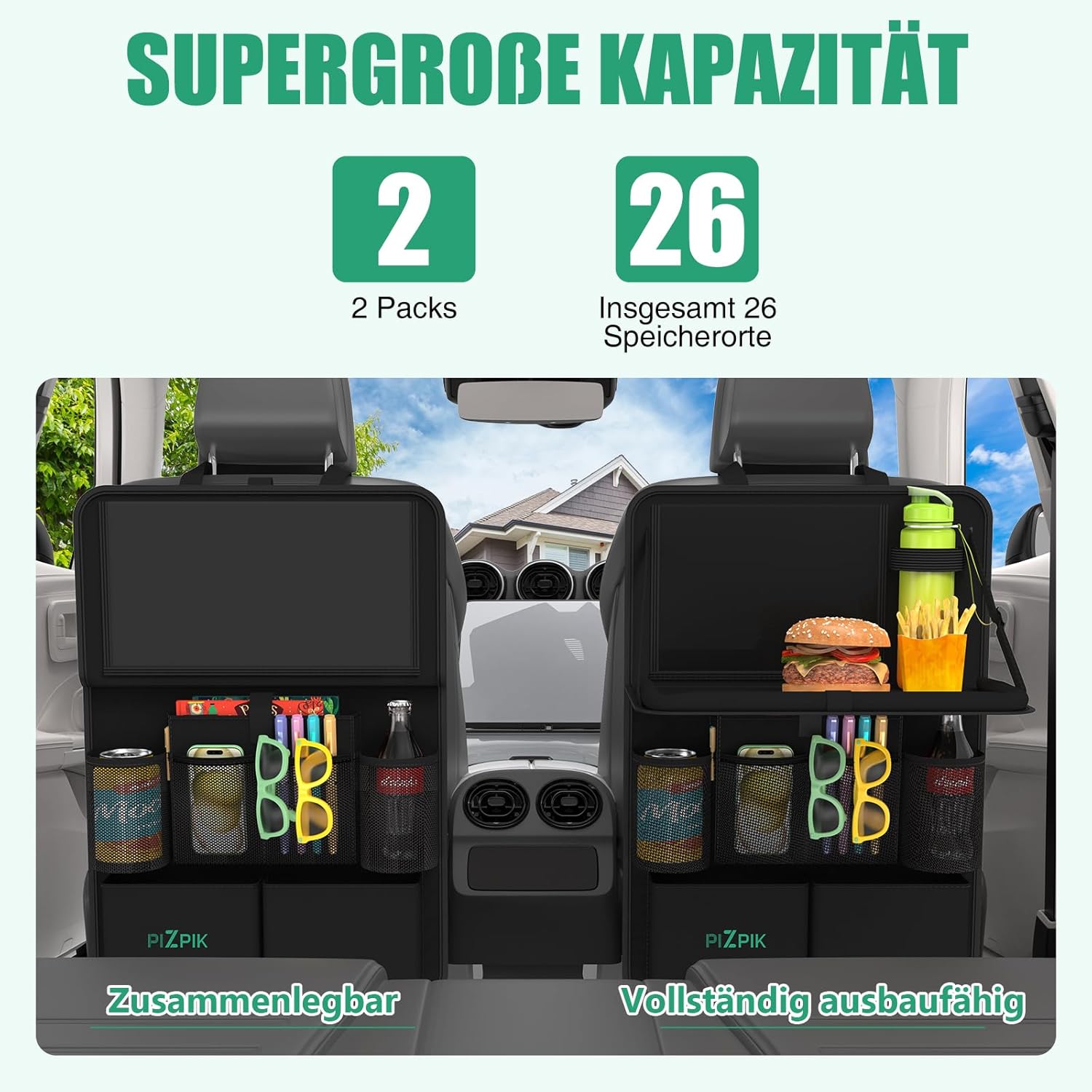 Органайзер за кола, 2 големи протектора за облегалка, органайзер за детски столчета за кола със сгъваема маса, 12 джоба, водоустойчива защита за задната седалка за деца, органайзер за аксесоари за пътуване с кола (черен)