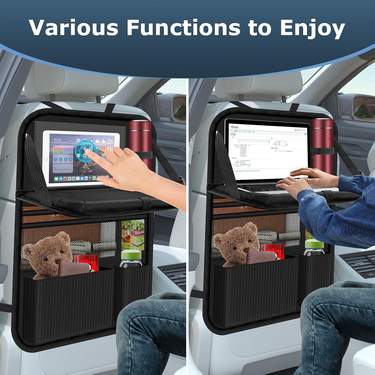 • Подобрена сгъваема тава: Подобреният органайзер за кола има сгъваема тава. Това е проектирано, за да улесни използването на сгъваемата маса за хранене и развлекателни дейности. Органайзерът за столче за кола може да се използва като маса за хранене или поставка за таблет за работа или гледане на видеоклипове. Масата може да се сгъва плоско за компактно съхранение, когато не се използва.