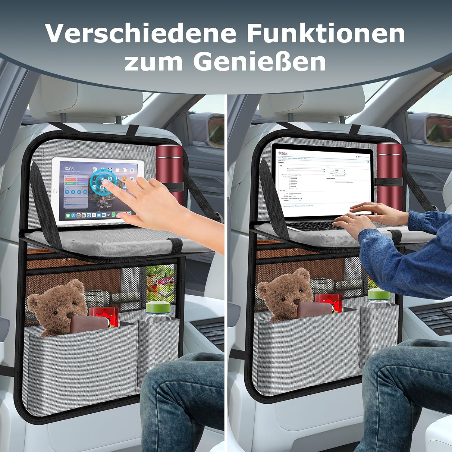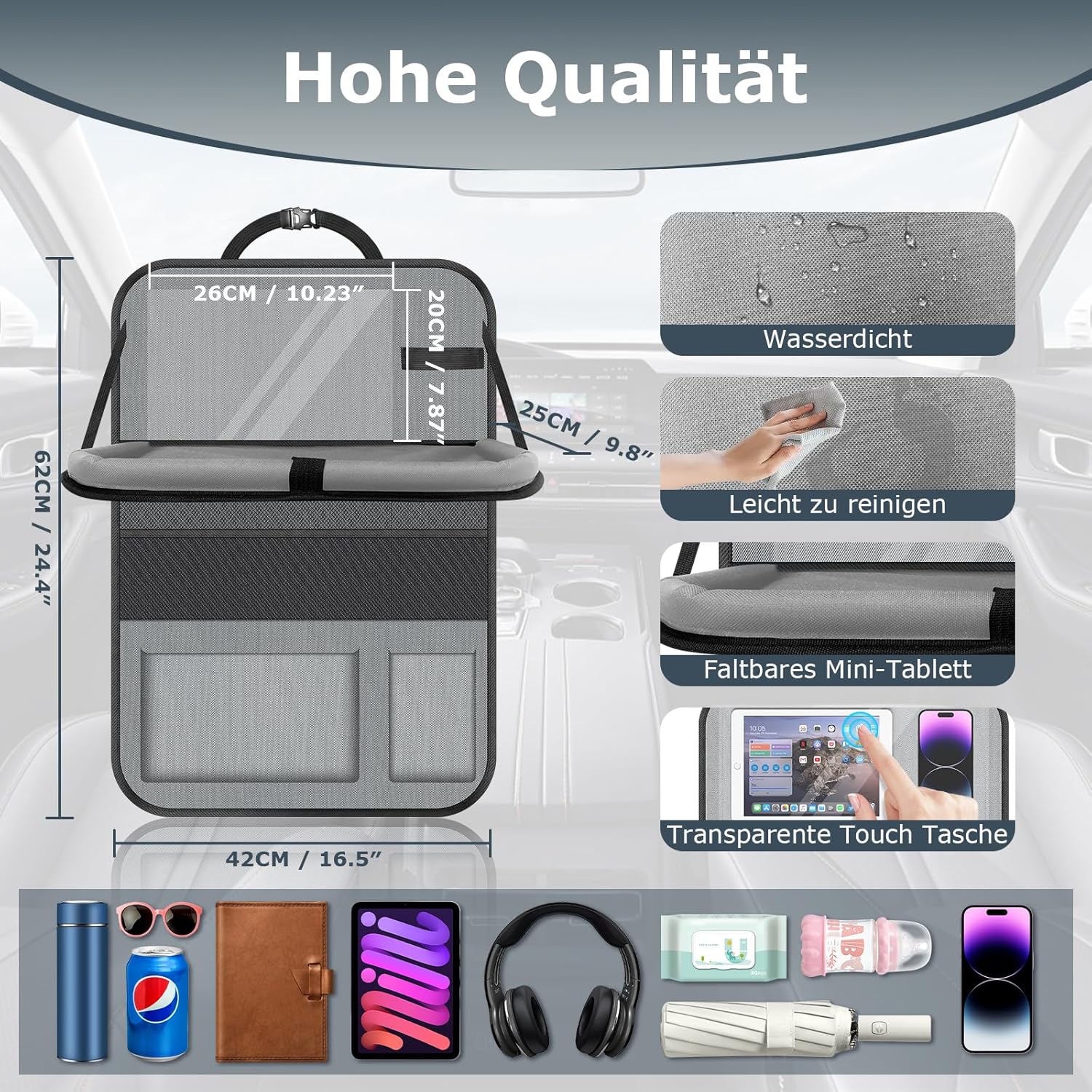 • Подобрена сгъваема тава: Подобреният органайзер за кола има сгъваема тава. Това е проектирано, за да улесни използването на сгъваемата маса за хранене и развлекателни дейности. Органайзерът за столче за кола може да се използва като маса за хранене или поставка за таблет за работа или гледане на видеоклипове. Масата може да се сгъва плоско за компактно съхранение, когато не се използва.