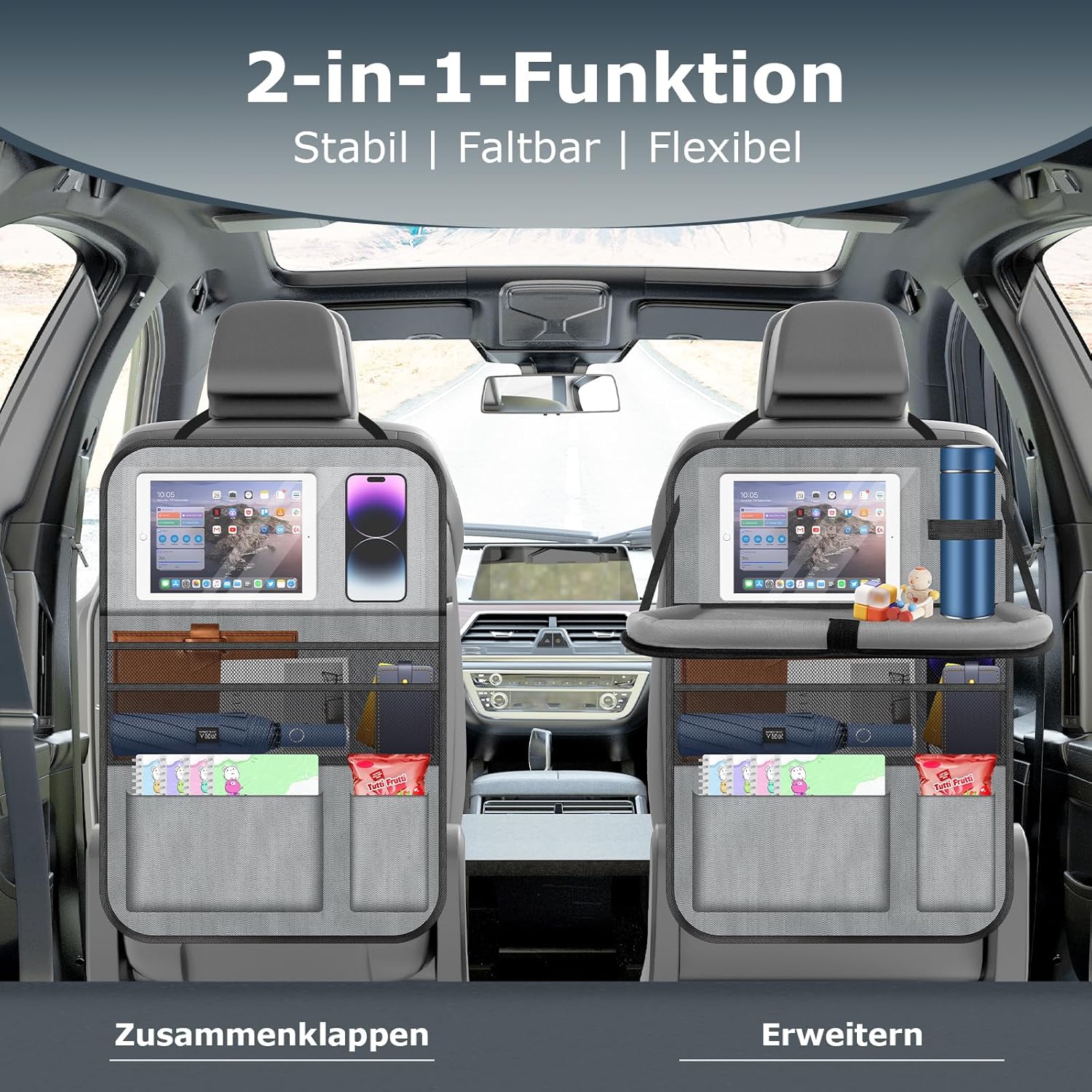 • Чанта за многократно съхранение: С 9 джоба за съхранение с различни размери и 1 сгъваема масичка, за да ви осигури повече място за съхранение. Сензорният екран може да се управлява чрез прозрачен сензорен джоб и е подходящ за повечето мобилни телефони и малки таблети. Нашият детски органайзер за кола може да побере книги, детски играчки, чаши за вода, таблети и др.