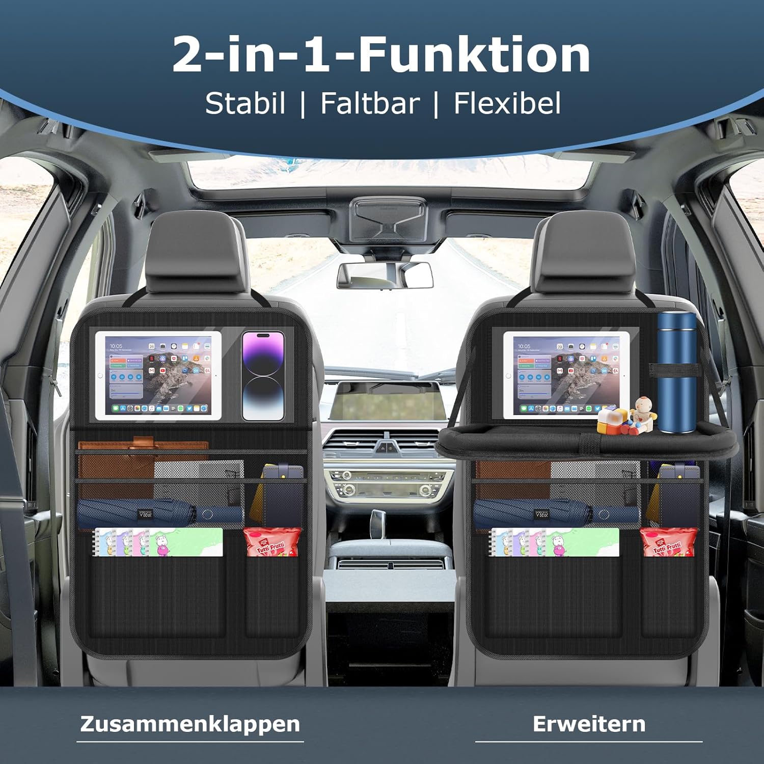 Органайзер за кола, пакет от 2 органайзера за автомобилна седалка, голяма защита за облегалката, кола, деца, многофункционален, водоустойчив, органайзер за задна седалка със сгъваема маса, чанта за таблет и много джобове, черен