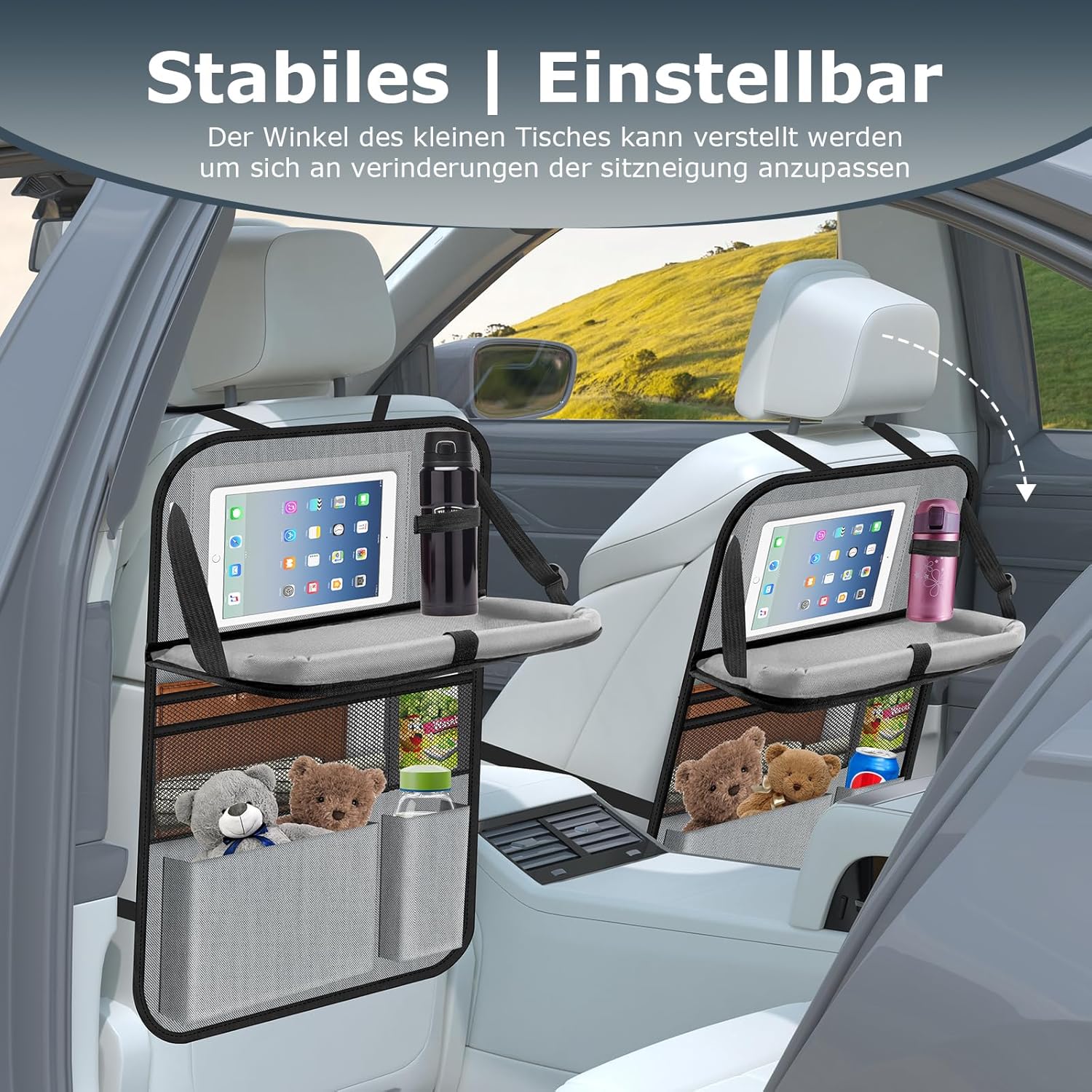 • Чанта за многократно съхранение: С 9 джоба за съхранение с различни размери и 1 сгъваема масичка, за да ви осигури повече място за съхранение. Сензорният екран може да се управлява чрез прозрачен сензорен джоб и е подходящ за повечето мобилни телефони и малки таблети. Нашият детски органайзер за кола може да побере книги, детски играчки, чаши за вода, таблети и др.
