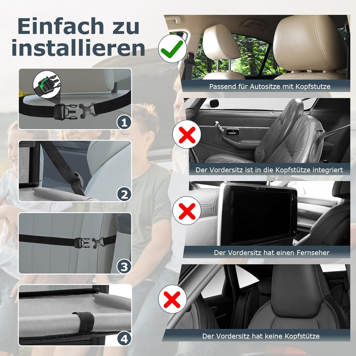 • Лесен монтаж: Нашият протектор за облегалка за детска кола е подходящ за повечето автомобили и SUV-ове. С изключение на автомобили с вградени възглавници и облегалки. Детският органайзер за кола с регулируеми презрамки може бързо да се закрепи или отстрани от предните седалки. Ъгълът може да се регулира по желание, за да се поддържа балансът на плота на масата. Размер на органайзера за столче за кола: 41 x 60 см.