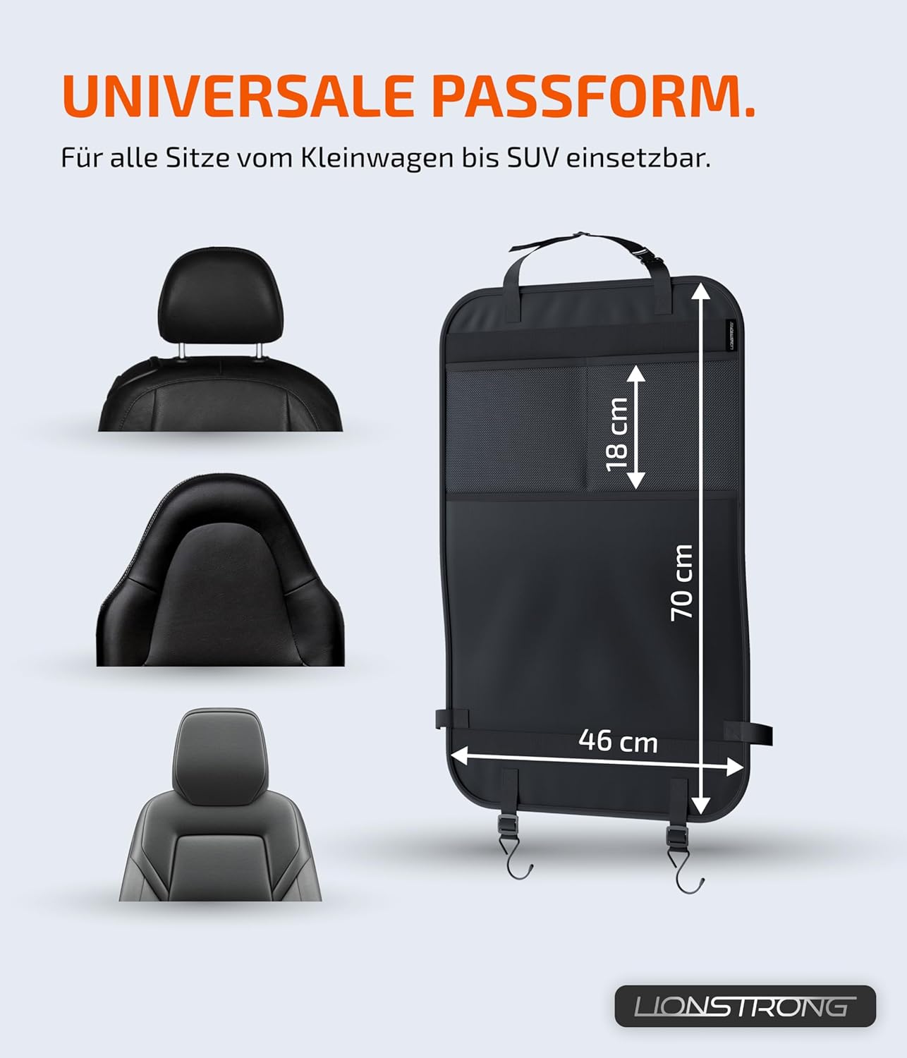 • Универсален – от малки автомобили до SUV-ове: органайзерът за задната седалка LIONSTRONG е съвместим с всички стандартни модели автомобили.