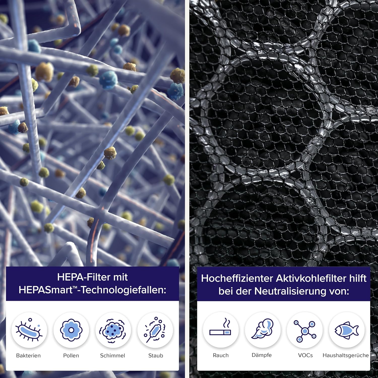 • 3 нива на филтрация: Състои се от фин предфилтър, H13 HEPA филтър и филтър с активен въглен. Премахва 99,97% прах, полени, дим, миризми и косми от домашни любимци. Филтрира също частици с размер до 0,3 микрона и филтрира замърсяването на въздуха от PM 2,5. Идеален за страдащи от алергии, астматици, собственици на домашни любимци, пушачи и деца.