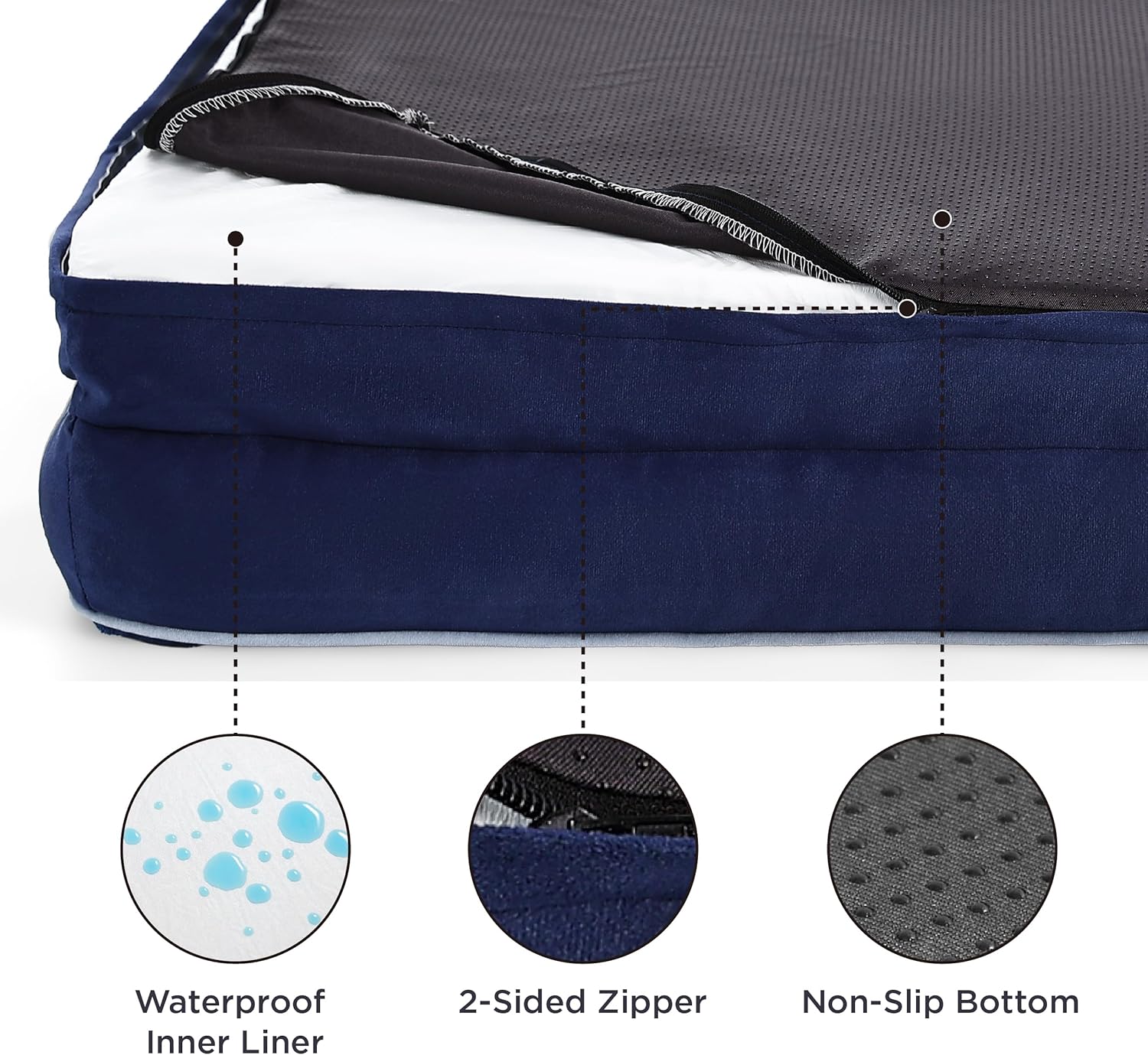 • Перещият се цип и водоустойчивият вътрешен слой от пяната предпазват кучешкото легло L от замърсяване.