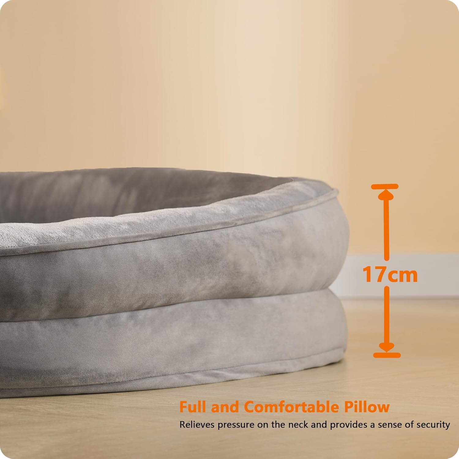 • ПО-ДОБЪР ДИЗАЙН Меката и удобна PP памучна подложка обгръща целия кръг, за да предпази врата на вашия домашен любимец и да осигури безопасно и удобно място за почивка. Външната страна е изработена от кадифе, вътрешната е изработена от фланелена смес, която е мека и удобна и отговаря на предпочитанията на вашето куче. Точковата пластмасова основа има противоплъзгаща функция, така че диванът да не се хлъзга и да е по-безопасен.