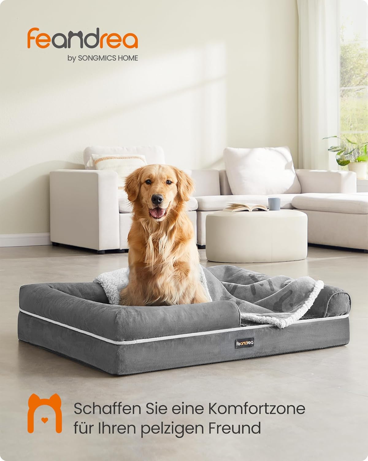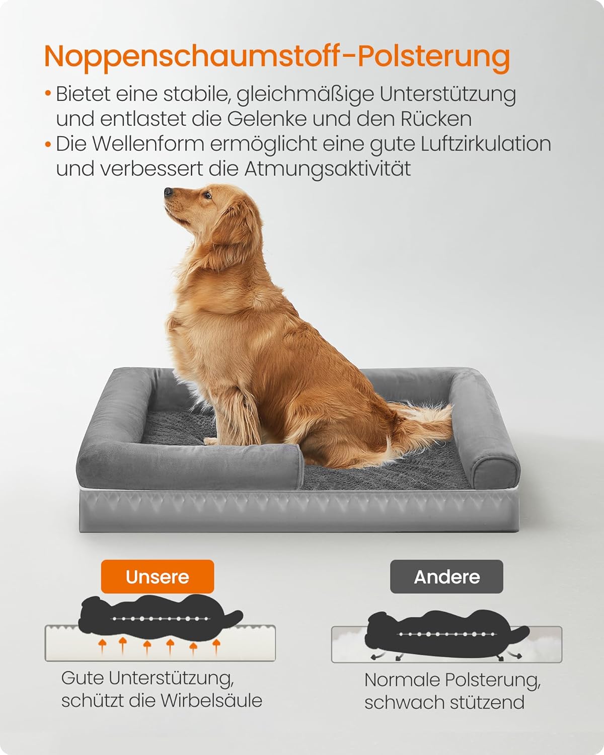 Ортопедично легло за кучета Feandrea, възглавница за кучета, кошница за кучета, мека подплата, диван за кучета, повдигнати ръбове, сваляем и перещ се калъф, 106 x 80 x 20 см, неплъзгаща се подложка, светло сиво, PGW077G02