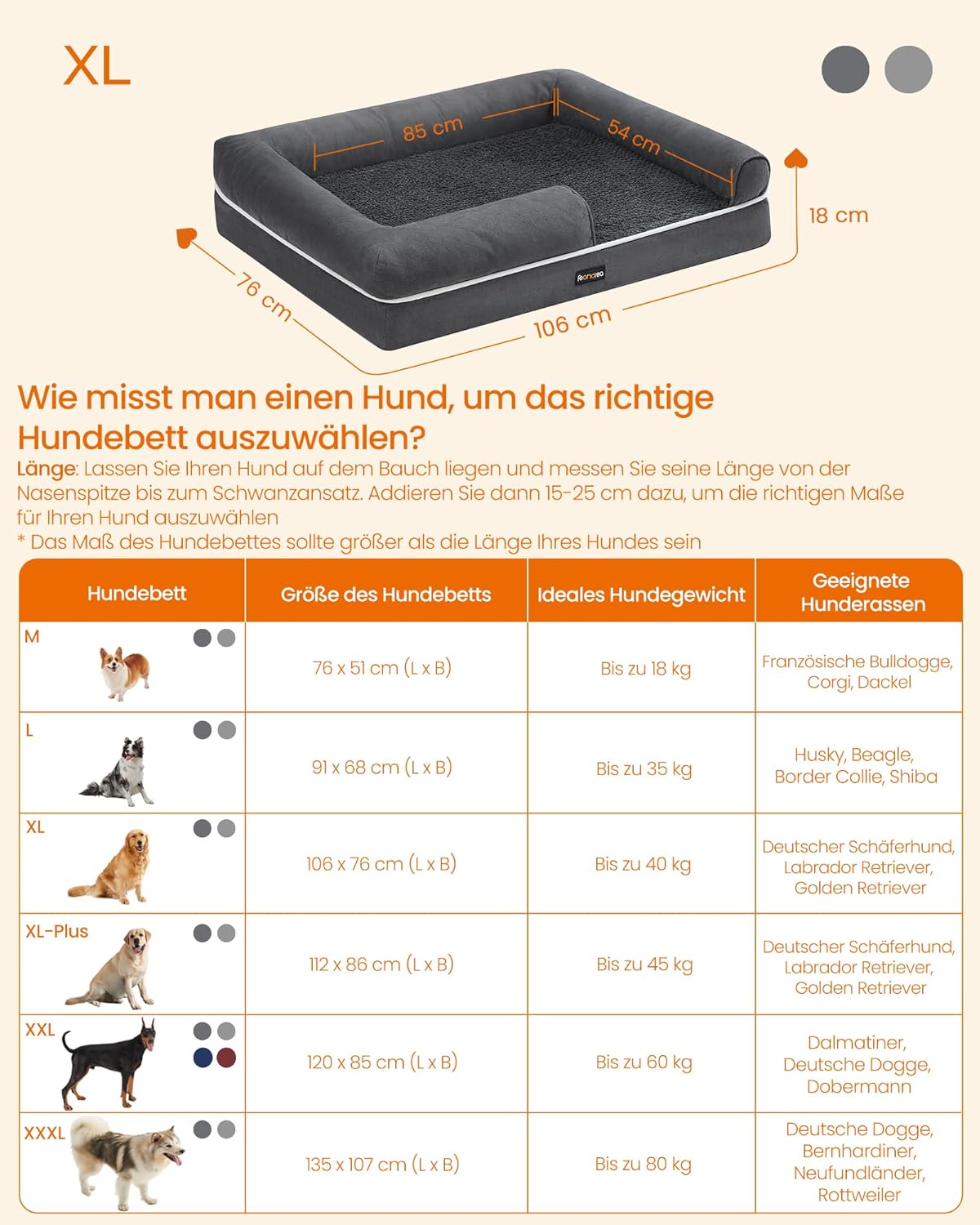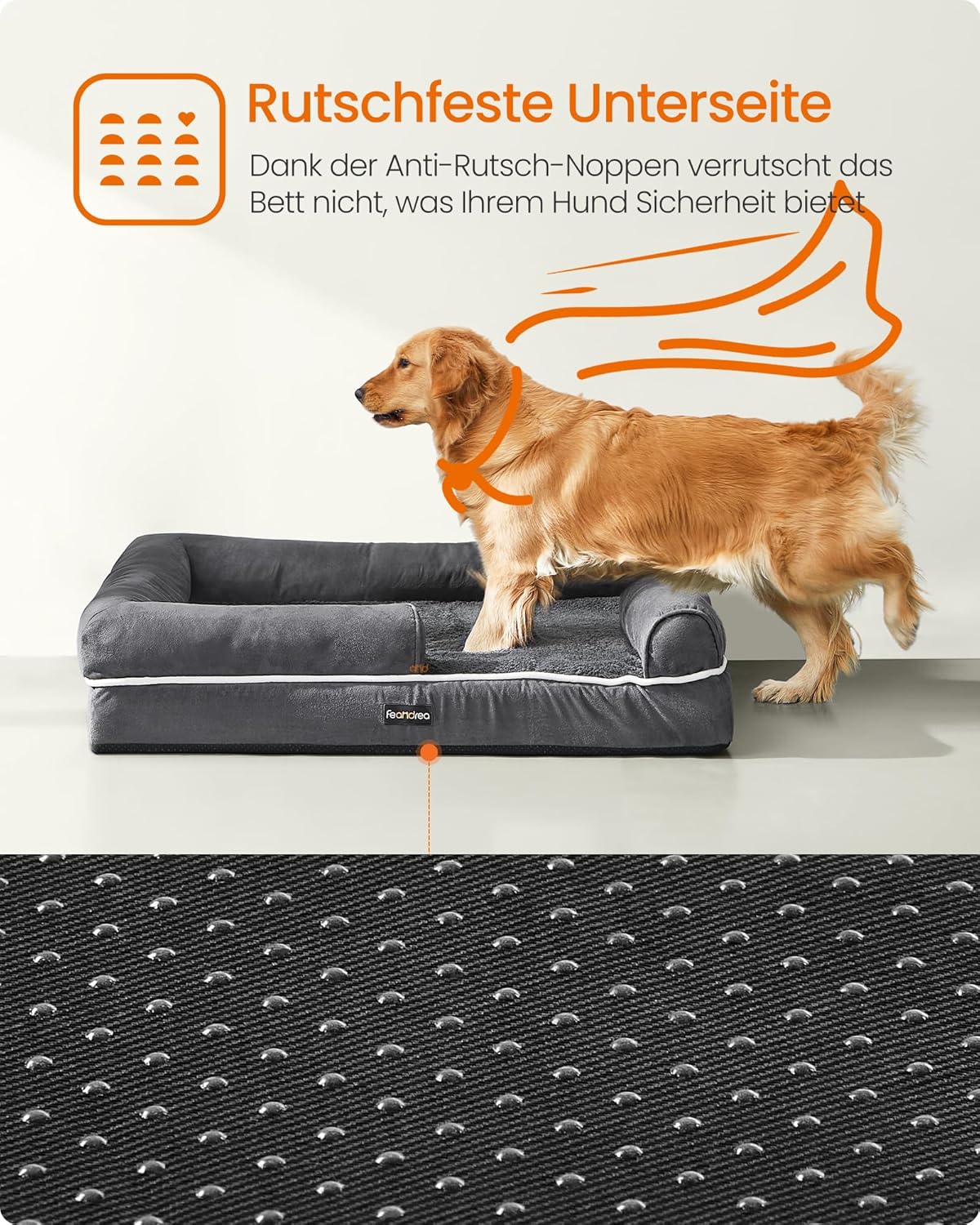 Ортопедично легло за кучета Feandrea, възглавница за кучета, кошница за кучета, мека подплата, диван за кучета, повдигнати ръбове, сваляем и перещ се калъф, 106 x 80 x 20 см, неплъзгаща се подложка, тъмносиво, PGW077G01
