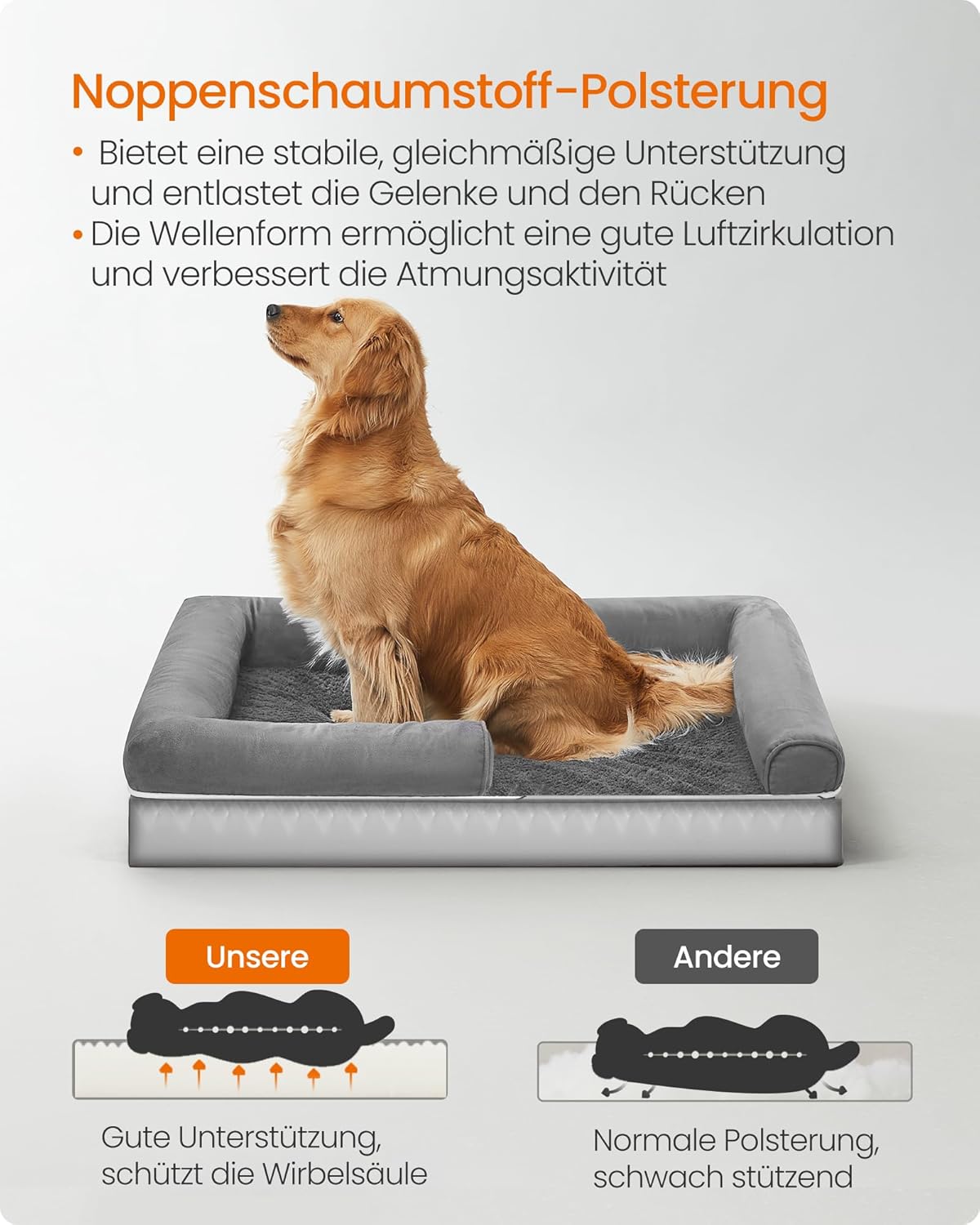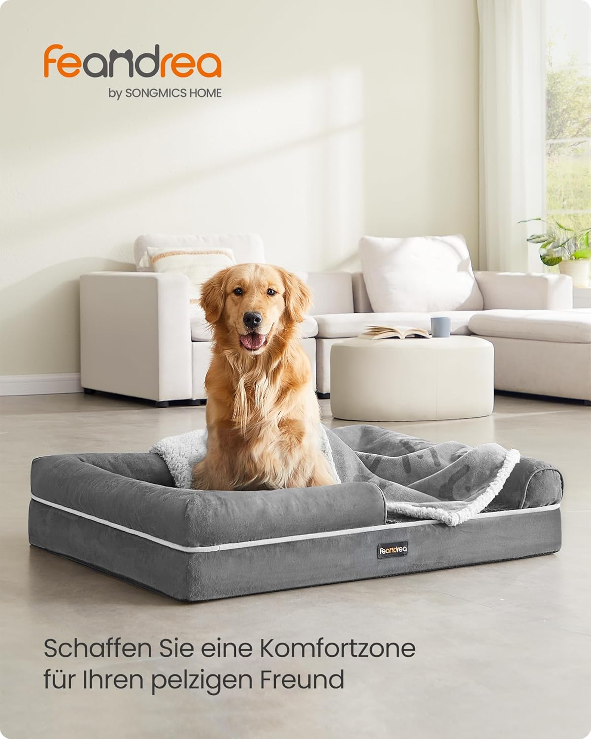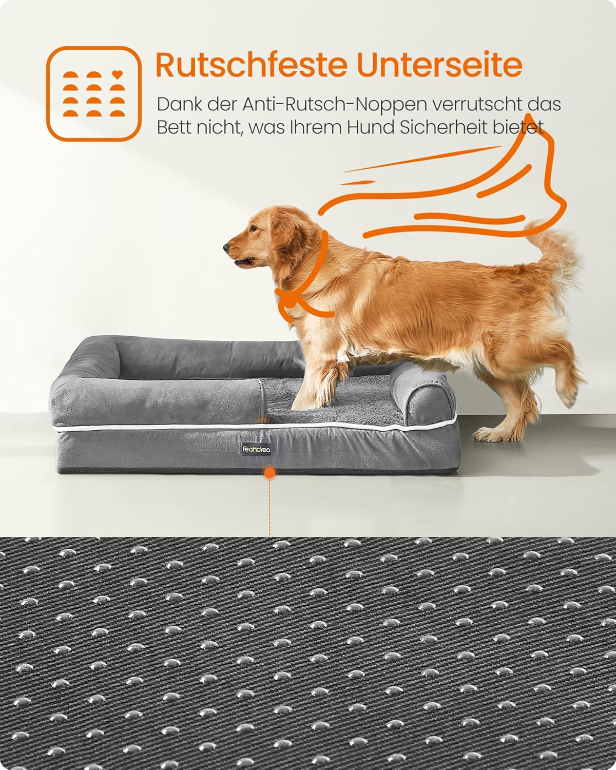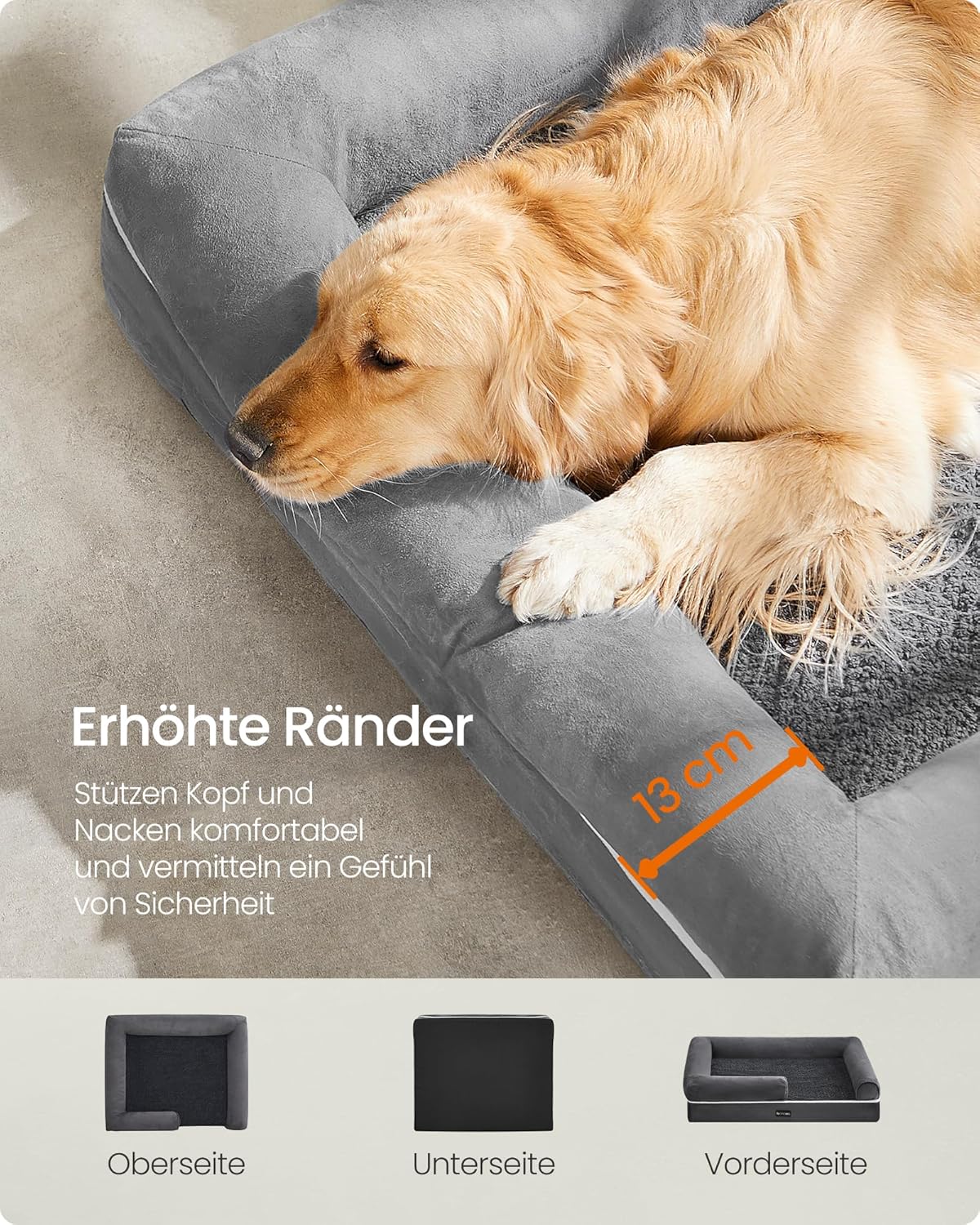 Ортопедично легло за кучета Feandrea, възглавница за кучета, кошница за кучета, мека подплата, диван за кучета, повдигнати ръбове, сваляем и перещ се калъф, 112 x 86 x 18 см, неплъзгаща се подложка, светло сиво PGW068G02V1