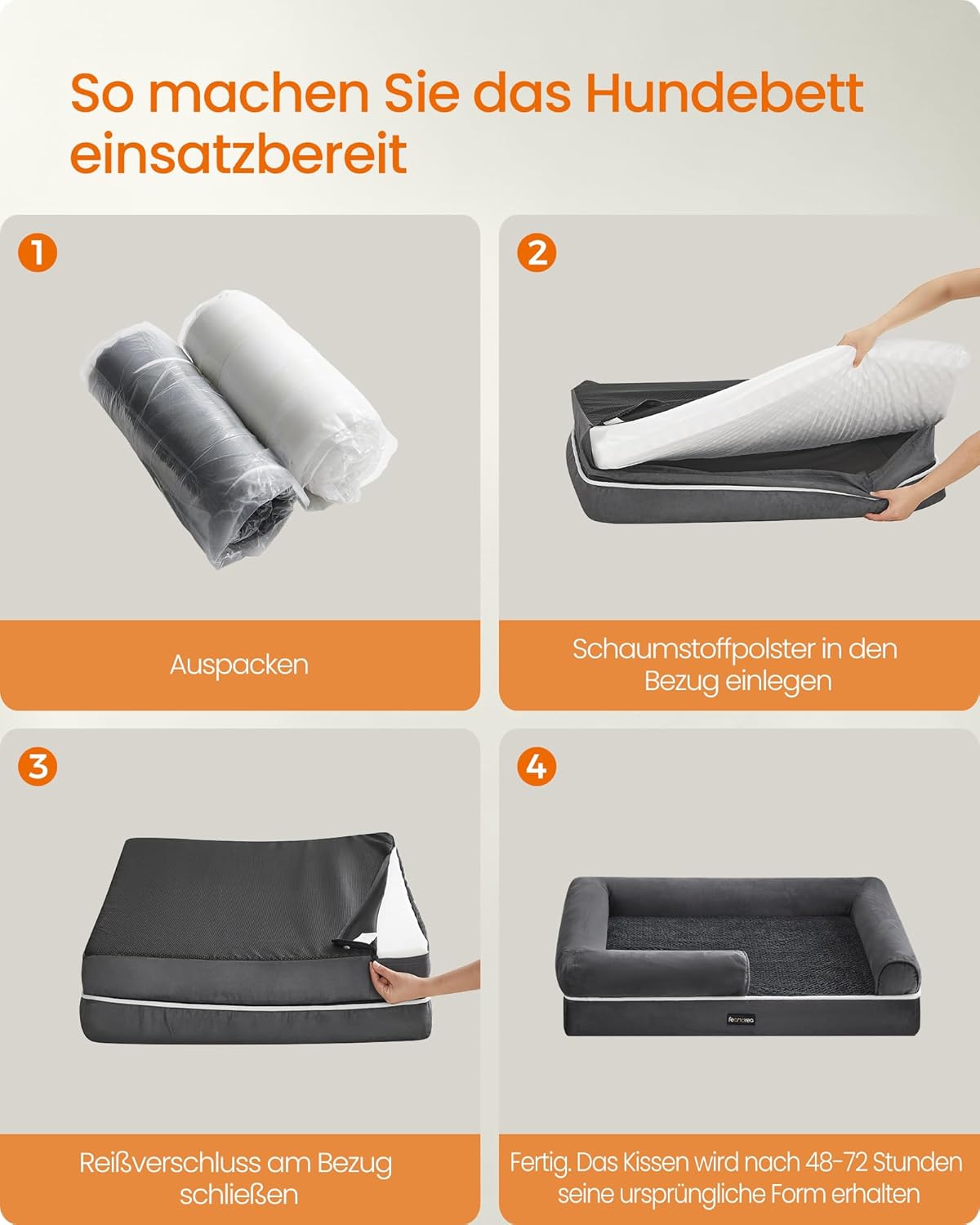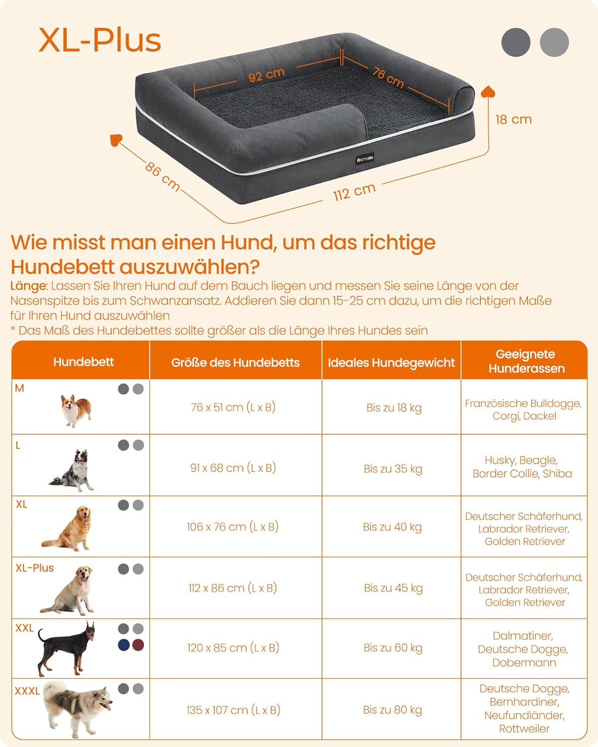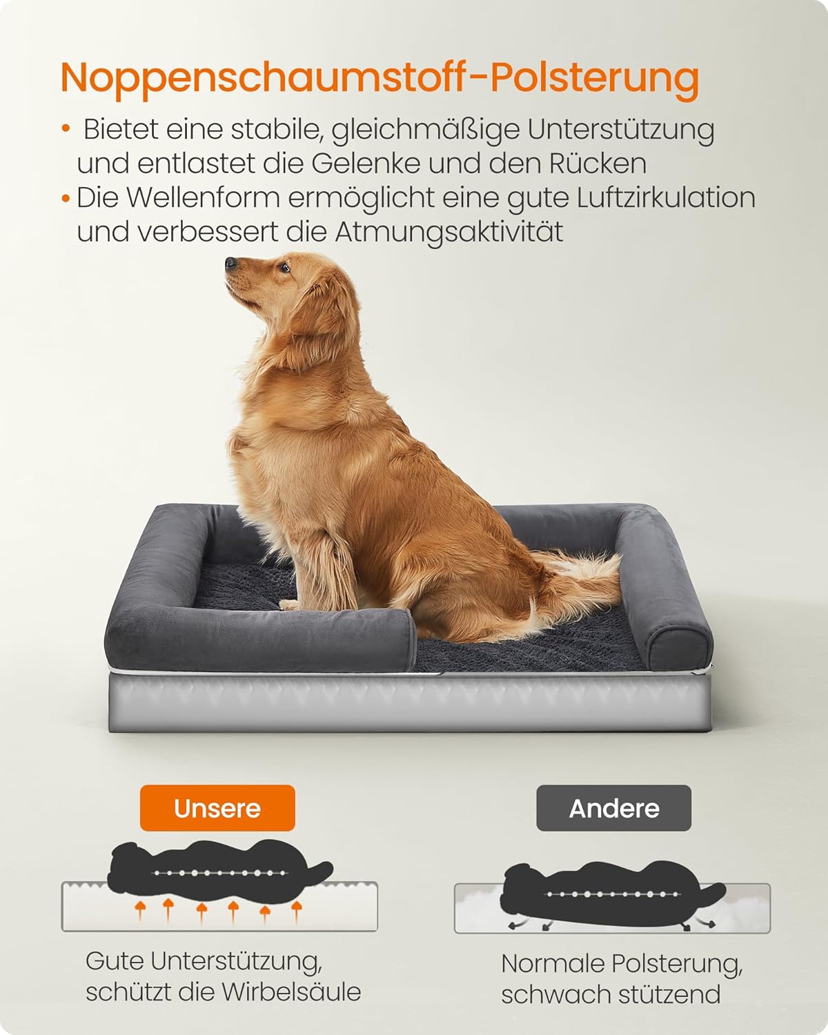 Ортопедично легло за кучета Feandrea, възглавница за кучета, кошница за кучета, мека подплата, диван за кучета, повдигнати ръбове, сваляем и перещ се калъф, 112 x 86 x 18 см, неплъзгаща се подложка, тъмносиво PGW068G01V1