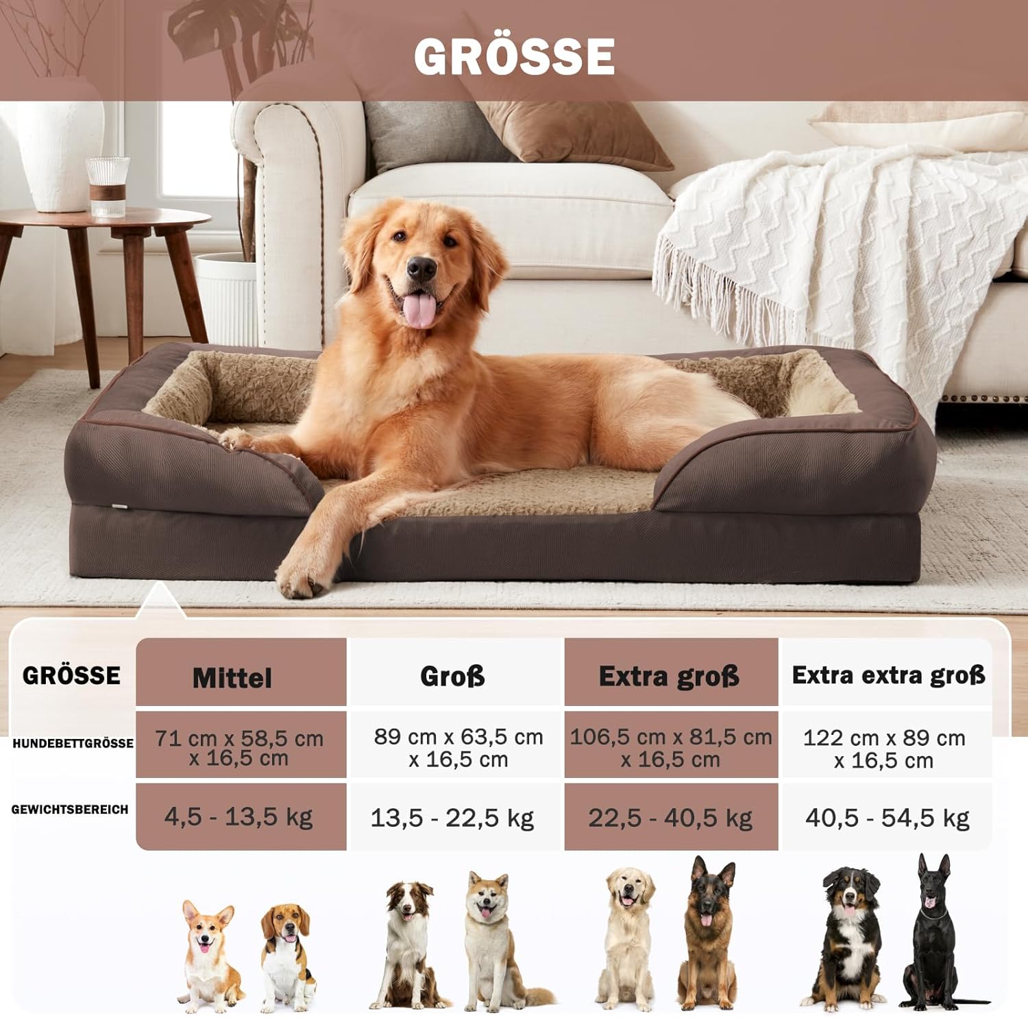 • Комфортът е приоритет: леглото за кучета за големи кучета с C-образен дизайн на шезлонг предлага приветливо и уютно пространство. Вашият домашен любимец ще се чувства комфортно и сигурно. Многобройните позиции за гушкане ви канят да се отпуснете и да помечтаете. Дизайнът, наподобяващ ограда, дава на кучетата чувство за сигурност, докато високите странични подложки осигуряват оптимална опора и подкрепа за врата и главата. Така вашият пухкав приятел може да подремне спокойно.