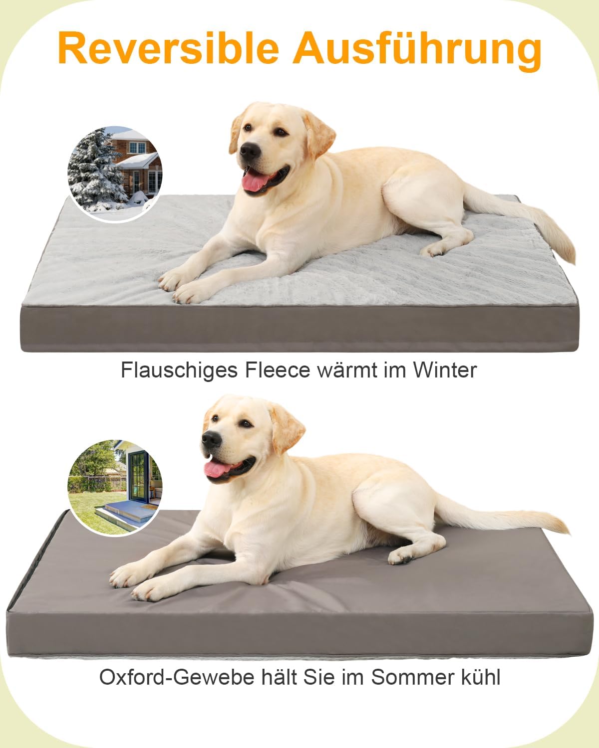 • Обръщащ се дизайн: леглата за кучета се предлагат от двете страни и могат да се използват по всяко време на годината без подмяна. Страната от полар държи кучето ви топло в студените нощи до отоплението, докато дишащата страна от оксфорд плат държи кучето ви хладно в слънчевите следобеди в градината. Защото в непредсказуем климат, комфортът трябва да се регулира за нула време, а не седмици след онлайн покупка. Добре дошли в предефинирането на интелигентния комфорт.