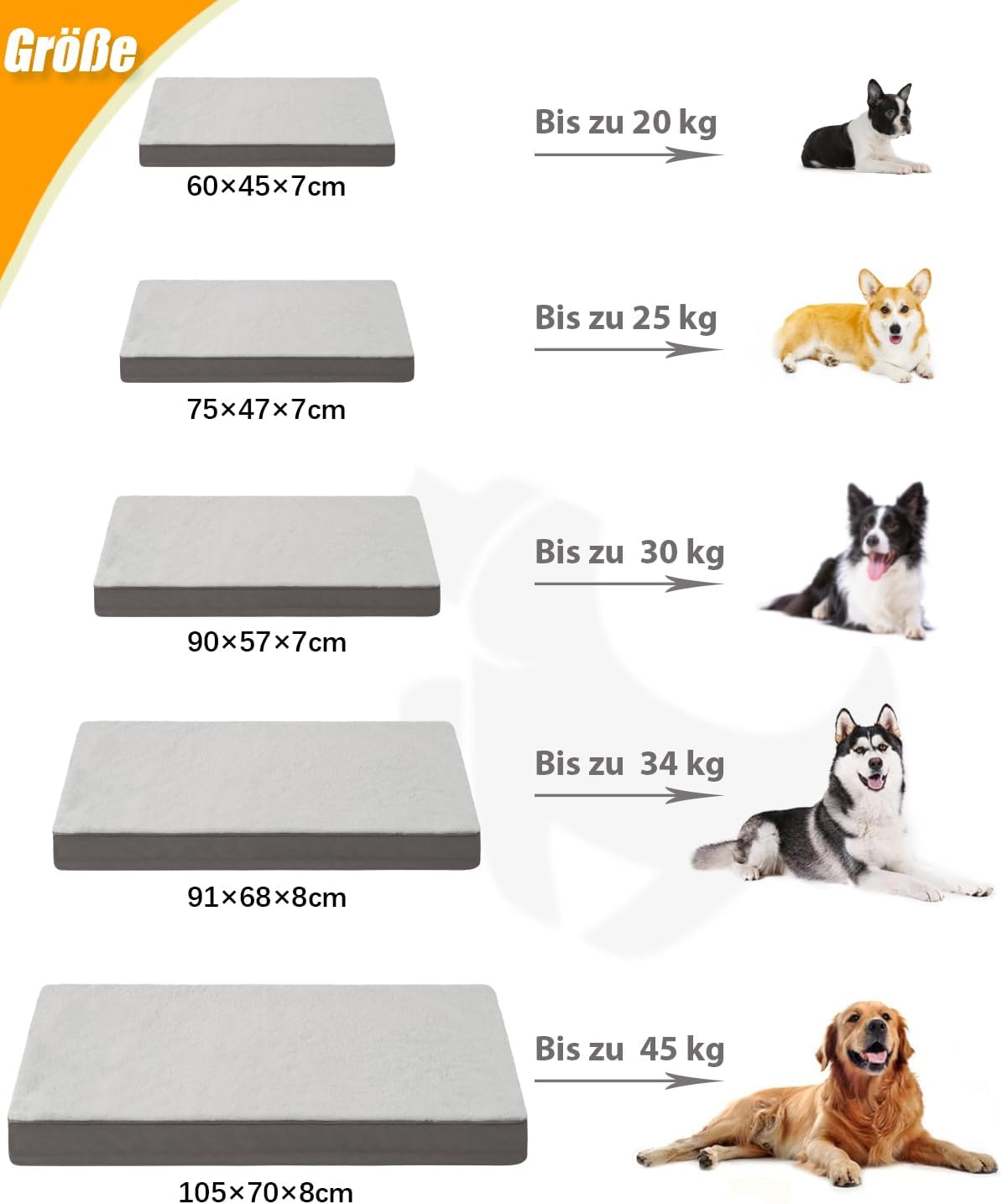 • МНОГО РАЗМЕРИ Нашите водоустойчиви легла за кучета, които могат да се перат, се предлагат в 7 размера, подходящи за повечето кучета и котки. Ето нашата таблица с размери за различни породи кучета: S за булдог, M за корги, L за шиба ину, L-plus за бордър коли, XL за хъски, XL-plus за голдън ретривър, XXL за лабрадор. За да е по-комфортно на кучето ви, можете да изберете по-голямо легло за кучета.