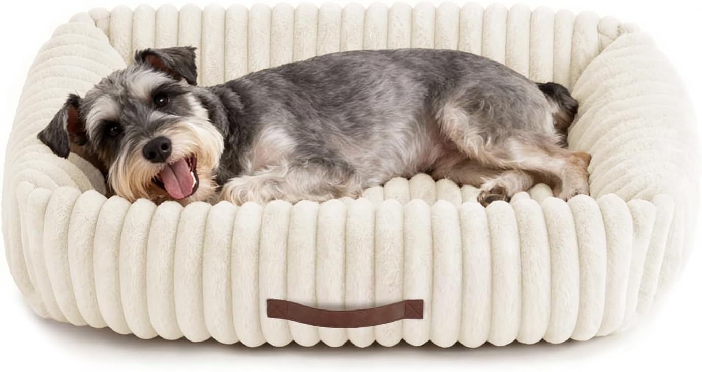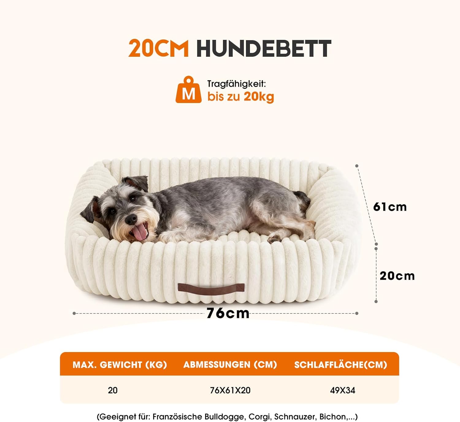 Ортопедично легло за кучета от кадифе MP с висока възглавница, перащо се легло за кучета с неплъзгаща се долна страна, бежово, 76 x 61 x 20 см