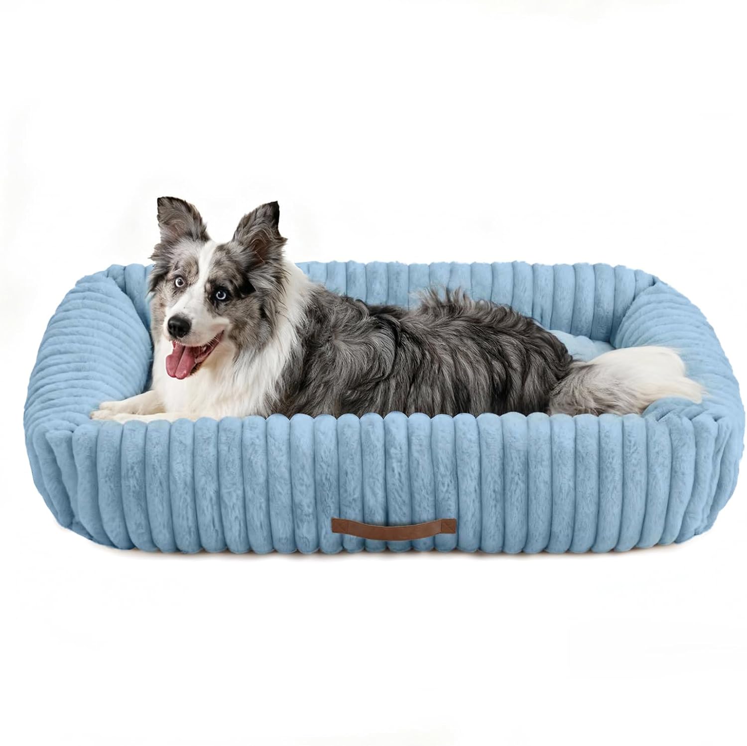 Ортопедично легло за кучета от кадифе XL с висока възглавница, перащо се легло за кучета с нехлъзгаща се долна страна (синьо, 109 x 76 x 20 см)