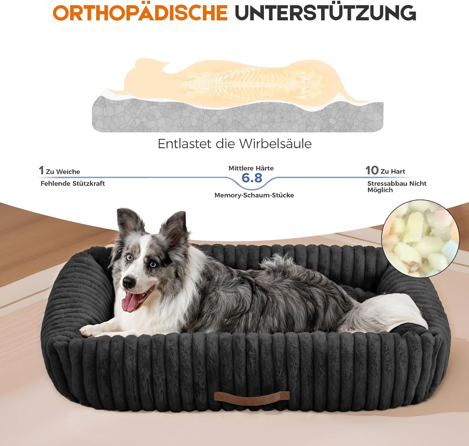 • ЧЕТИРИСТРАННА ВЪЗГЛАВНИЦА И СТАБИЛНОСТ Четирите странични възглавници и седалката на това кучешко легло са пълни с висококачествени парчета мемори пяна. Общото тегло е увеличено до 4,4 кг за перфектна стабилност. Поддържа главата и тялото, облекчава ставите, осигурява 360° сигурност, сякаш е в ръцете на майка.