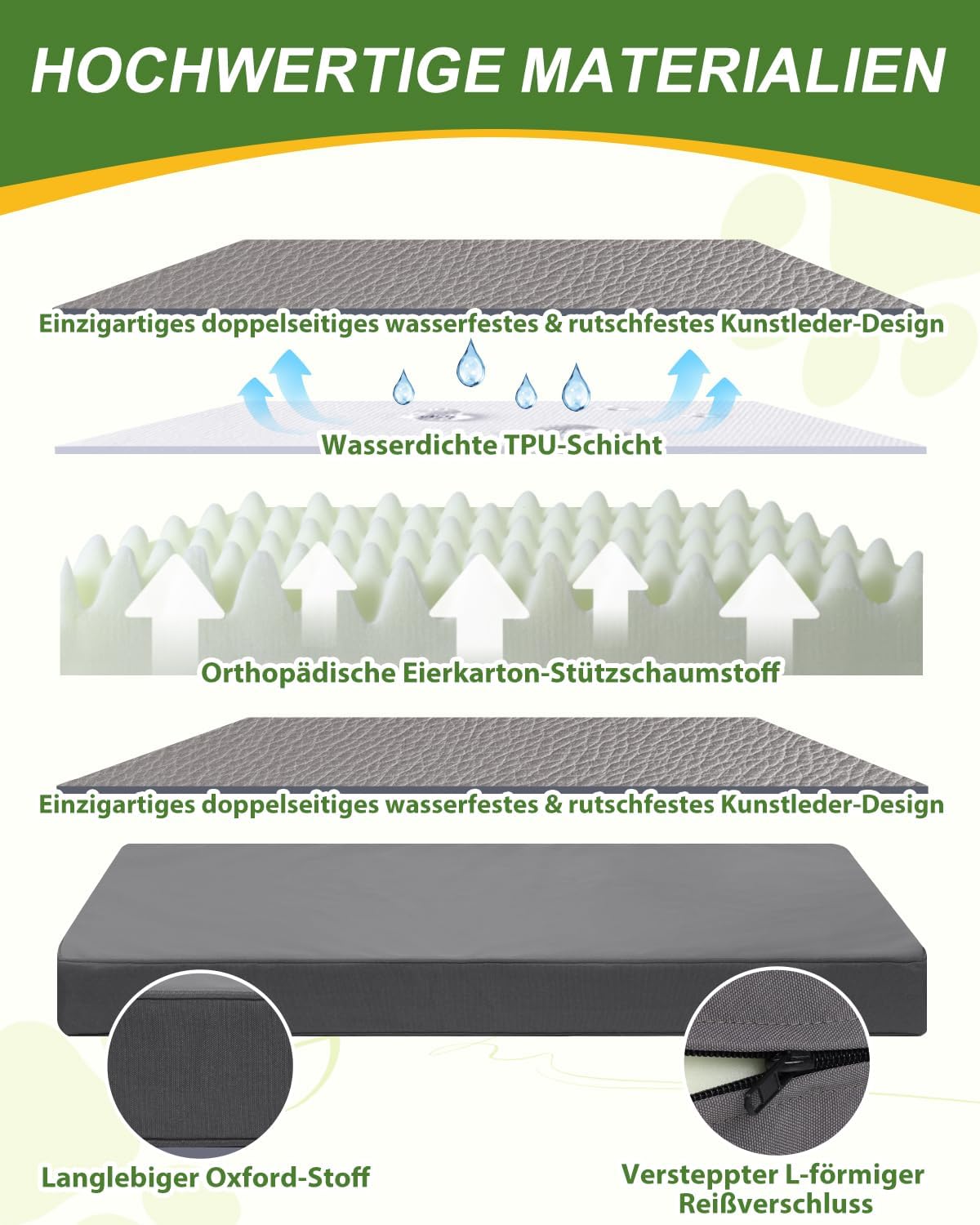 • Силна опора за спокоен сън: нашето кучешко легло с пълнеж от пяна с висока плътност с дебелина 8 см надеждно предпазва от студени подове и осигурява стабилна опора дори на тежки кучета. Здравата 25D пяна остава размерно стабилна дори след месеци употреба - идеално за кучешки легла за големи кучета, които се нуждаят от дълготраен комфорт. Тук вашият четириног приятел спи като на облак и има спокоен нощен сън.