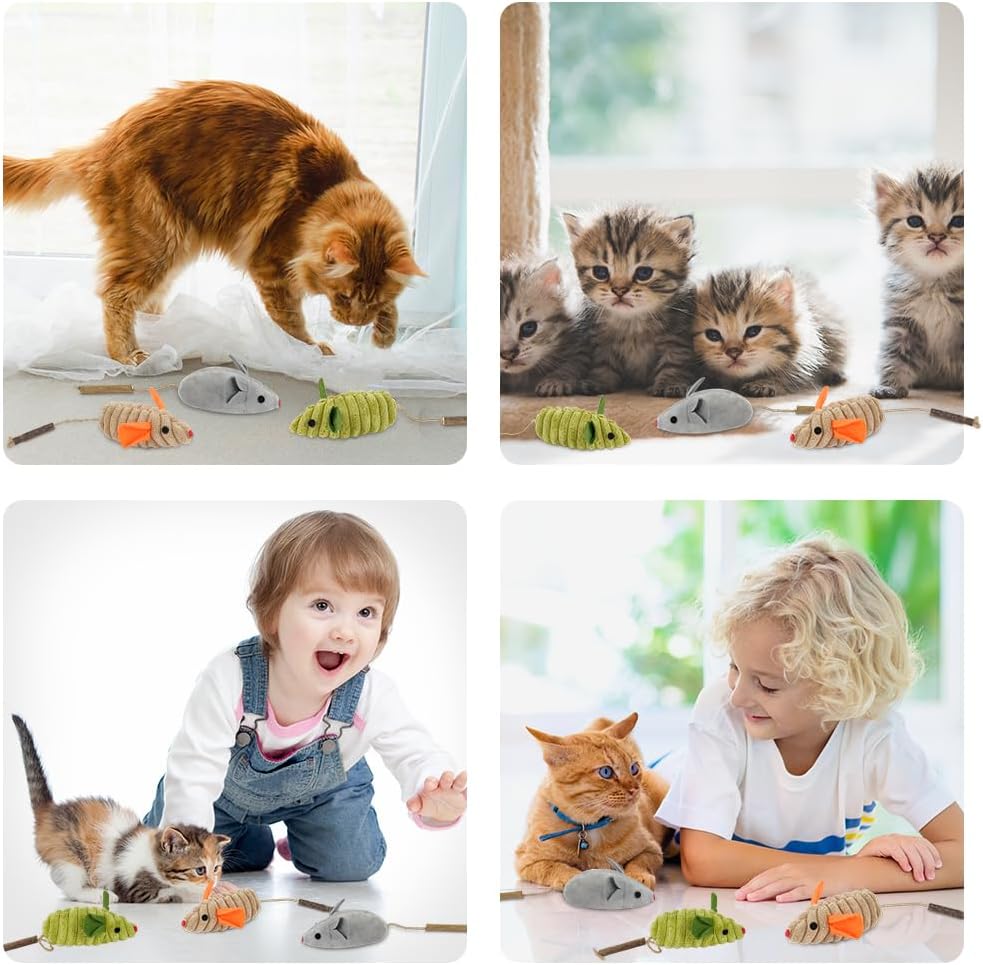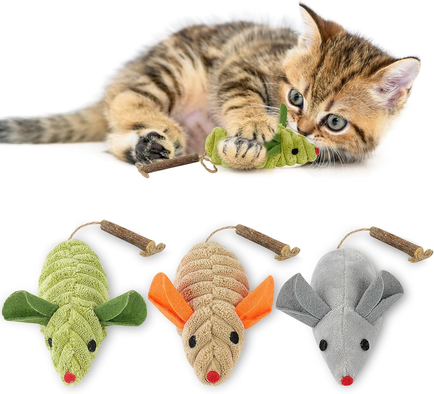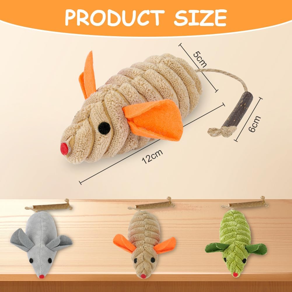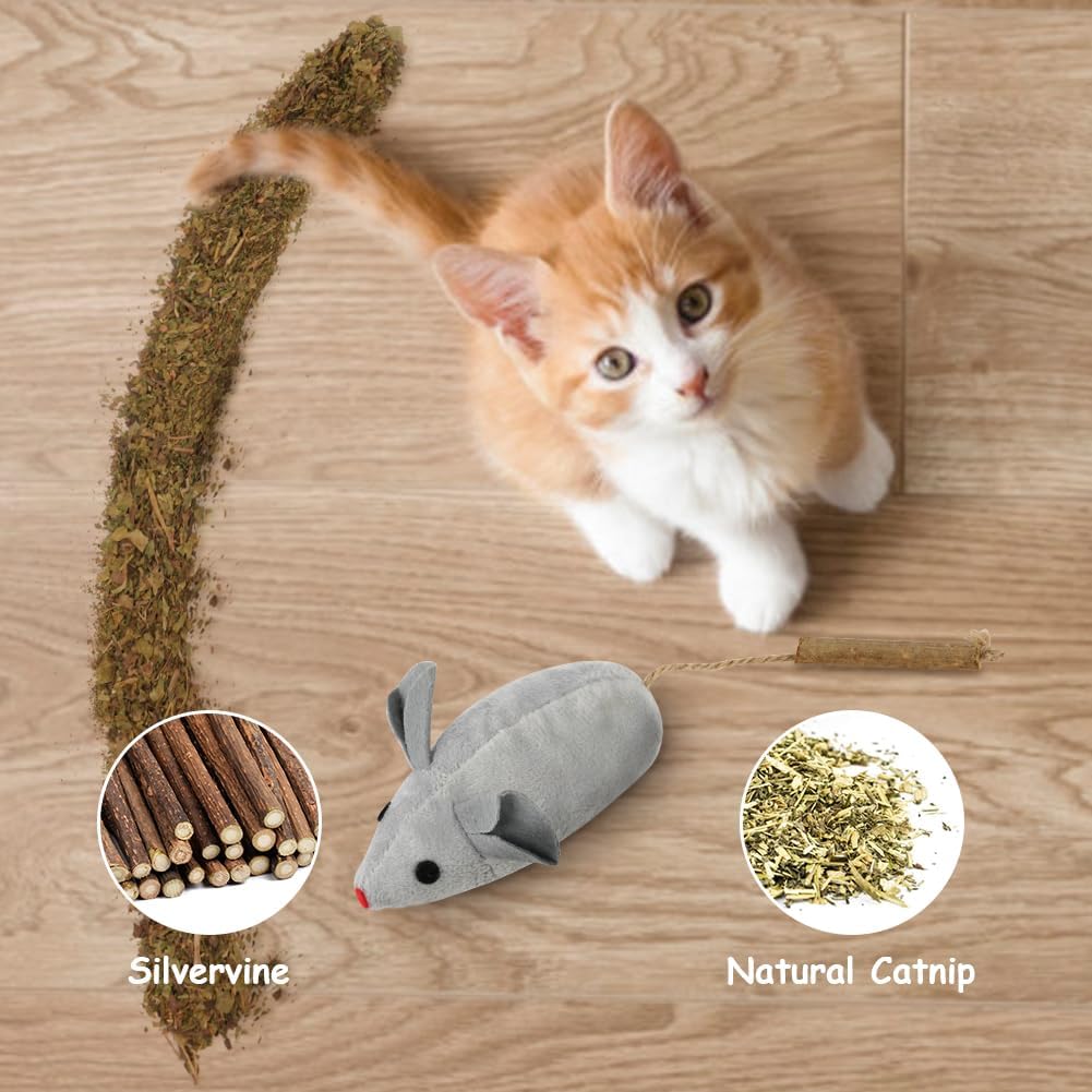 OSDUE играчка за котки мишка, пакет от 3 играчки котешка трева, плюшена играчка мишка за котенца, дървени пръчици за дъвчене на котки за грижа за зъбите на котките и срещу лош дъх