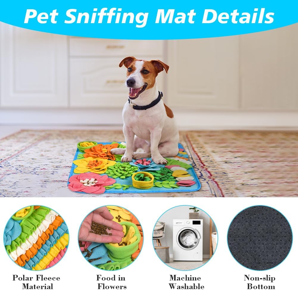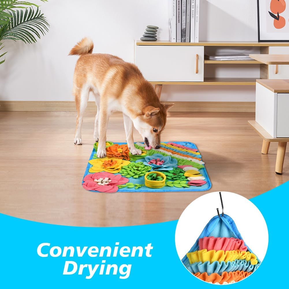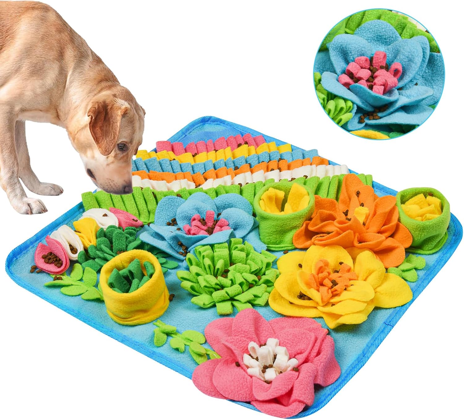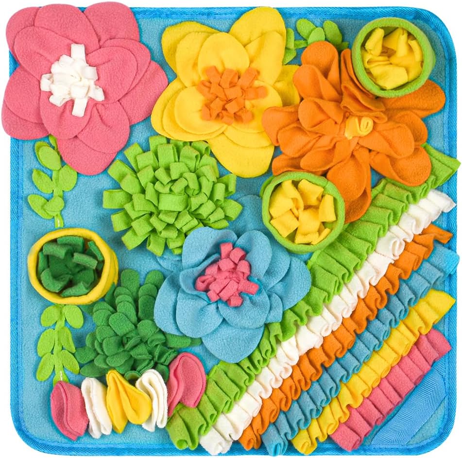 • Уникален и забавен дизайн: тази подложка за душене за кучета се отличава с ярък флорален мотив със зелен растителен мотив. Цветните форми служат като скривалища за храна и правят игрите с търсене на храна по-привлекателни. Тази подложка е предназначена за скриване на лакомства за кучета и помага за облекчаване на стреса, позволява на кучето ви да използва обонянието си и да изгаря енергия, а също така може да помогне за намаляване на теглото му.