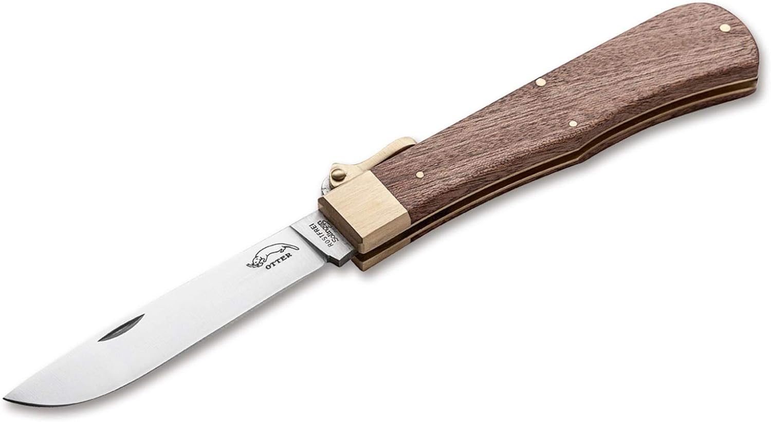 Мощният сгъваем нож Otter е солиден работен нож с заключващ механизъм и корпус от сапеле. Острието от неръждаема стомана 4034 е фино сатенирано. За отключване месинговата скоба на гърба на дръжката се сгъва напред и се натиска надолу. Челюстите и дъските са изработени от месинг.