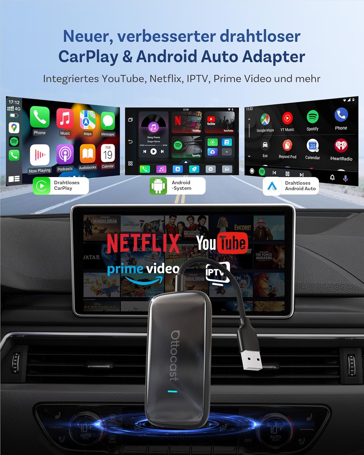 • 【Безжичен CarPlay и Android Auto – Предефиниране на вашето шофьорско изживяване】С адаптера Ottocast CarPlay Netflix можете да трансформирате всяка съществуваща кабелна система в безжично решение. Съвместим с iPhone (iOS 10+) и Android 11+ – изпитайте незабавна връзка без заплетени кабели. Ottocast Play2video осигурява ясен гласов контрол, бързо време за реакция и спокойно шофиране – всичко това без USB кабели.