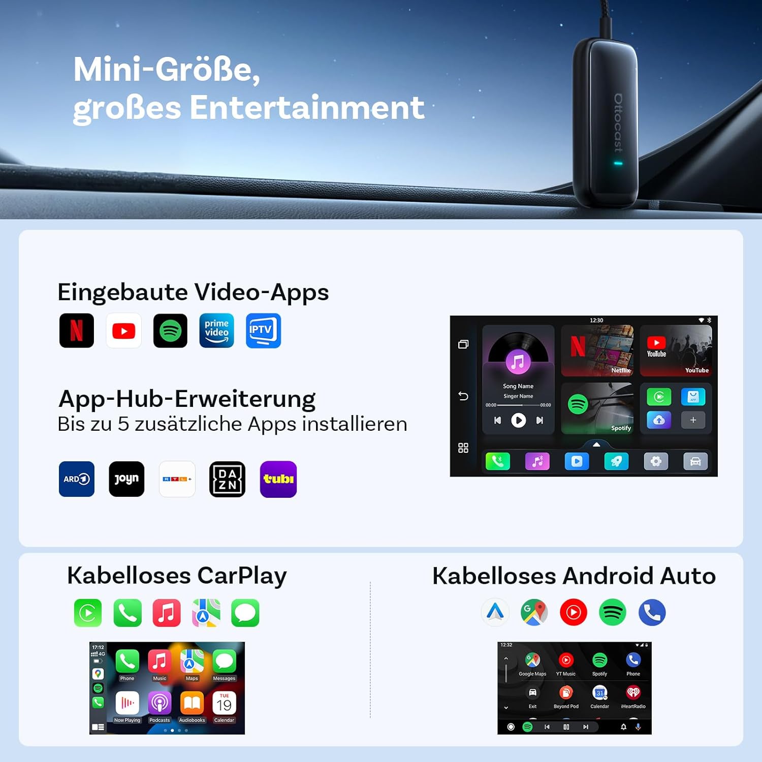 • 【Неограничено стрийминг изживяване】OTTOCAST Play2Video Ultra мигновено превръща дисплея на колата ви в частно кино! Наслаждавайте се на стрийминг от популярни платформи като Netflix, YouTube, Spotify, Prime Video и IPTV. Изтеглете до пет допълнителни приложения, като DAZN, RTL+ и Joyn, чрез вградения App Hub. Възпроизвеждането чрез Wi-Fi точки за достъп или външни USB устройства го прави идеален спътник за дълги пътувания с кола и семейни екскурзии.