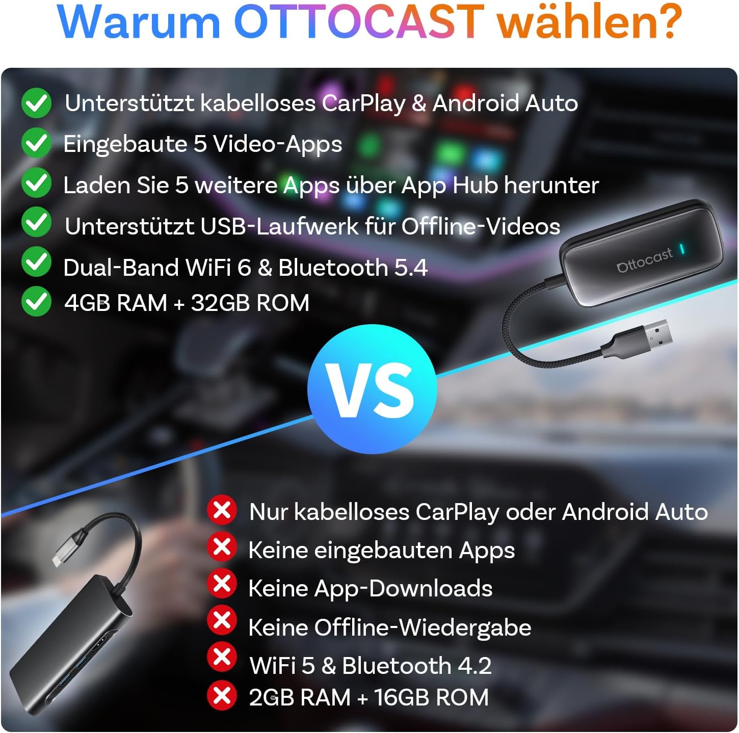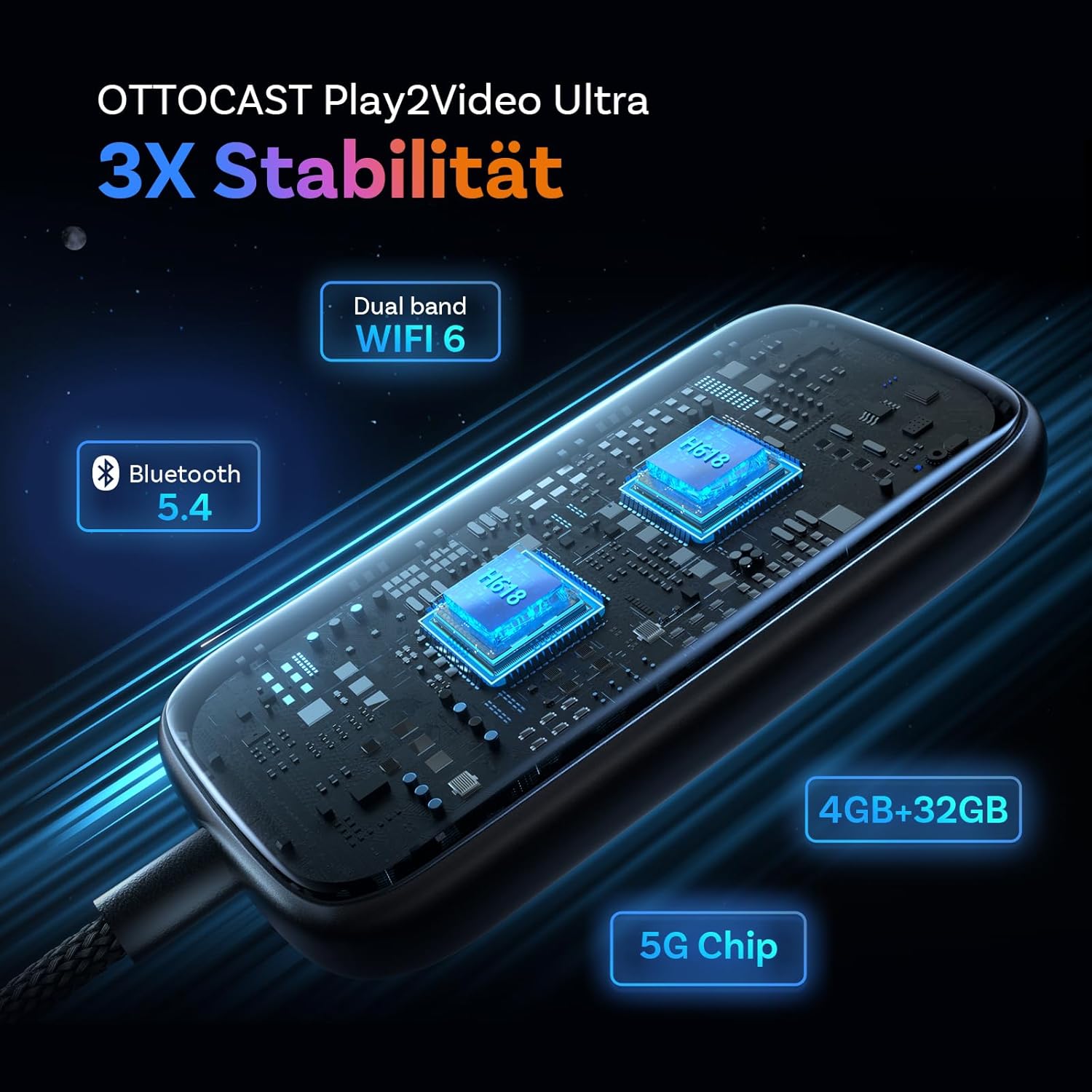 OTTOCAST Play2video Ultra 2026 Upgrade, безжичен CarPlay и Android Auto адаптер с YouTube/Netflix/Prime Video, Plug & Play, 4 GB + 32 GB AI Box за автомобили с кабелен CarPlay от 2016 г. нататък