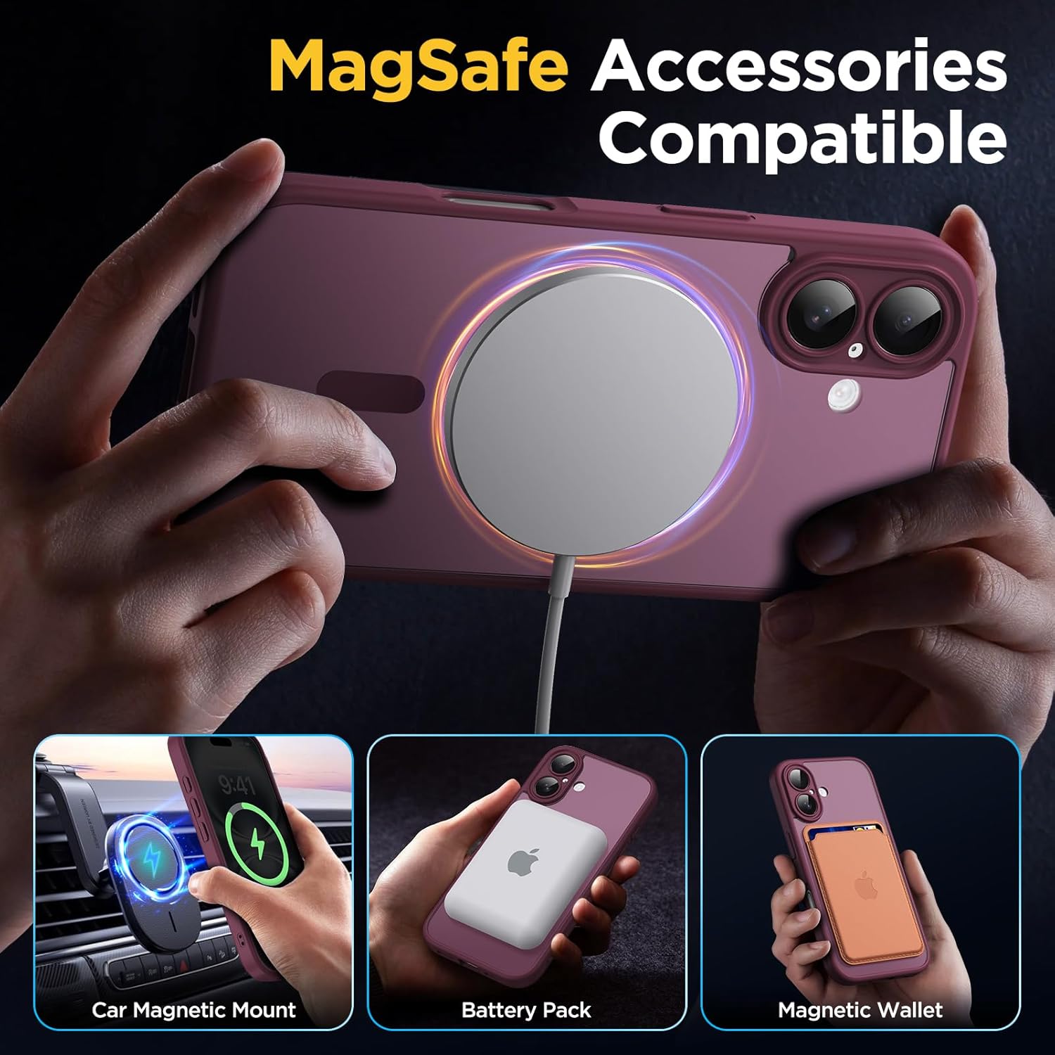• Функция за магнитно засмукване: Мощният вграден магнит подобрява магнитната връзка и осигурява автоматично подравняване, като е съвместим с всички аксесоари MagSafe, като например магнитни зарядни устройства с вендуза, магнитни пакети с вендуза, магнитни държачи с вендуза и други. Независимо дали сте в ежедневието или пътувате, можете да се насладите на практичността, която калъфът носи със себе си.