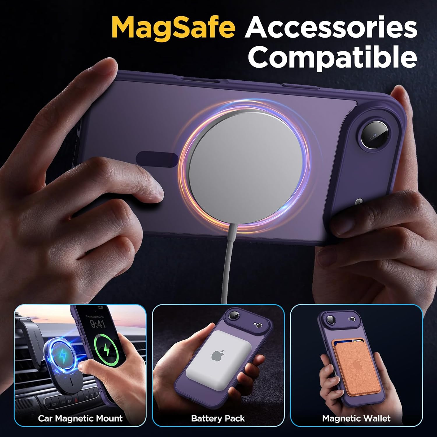 • Функция за магнитно засмукване: Мощният вграден магнит подобрява магнитната връзка и осигурява автоматично подравняване, като е съвместим с всички аксесоари MagSafe, като например магнитни зарядни устройства с вендуза, магнитни пакети с вендуза, магнитни държачи с вендуза и други. Независимо дали сте в ежедневието или пътувате, можете да се насладите на практичността, която калъфът носи със себе си.