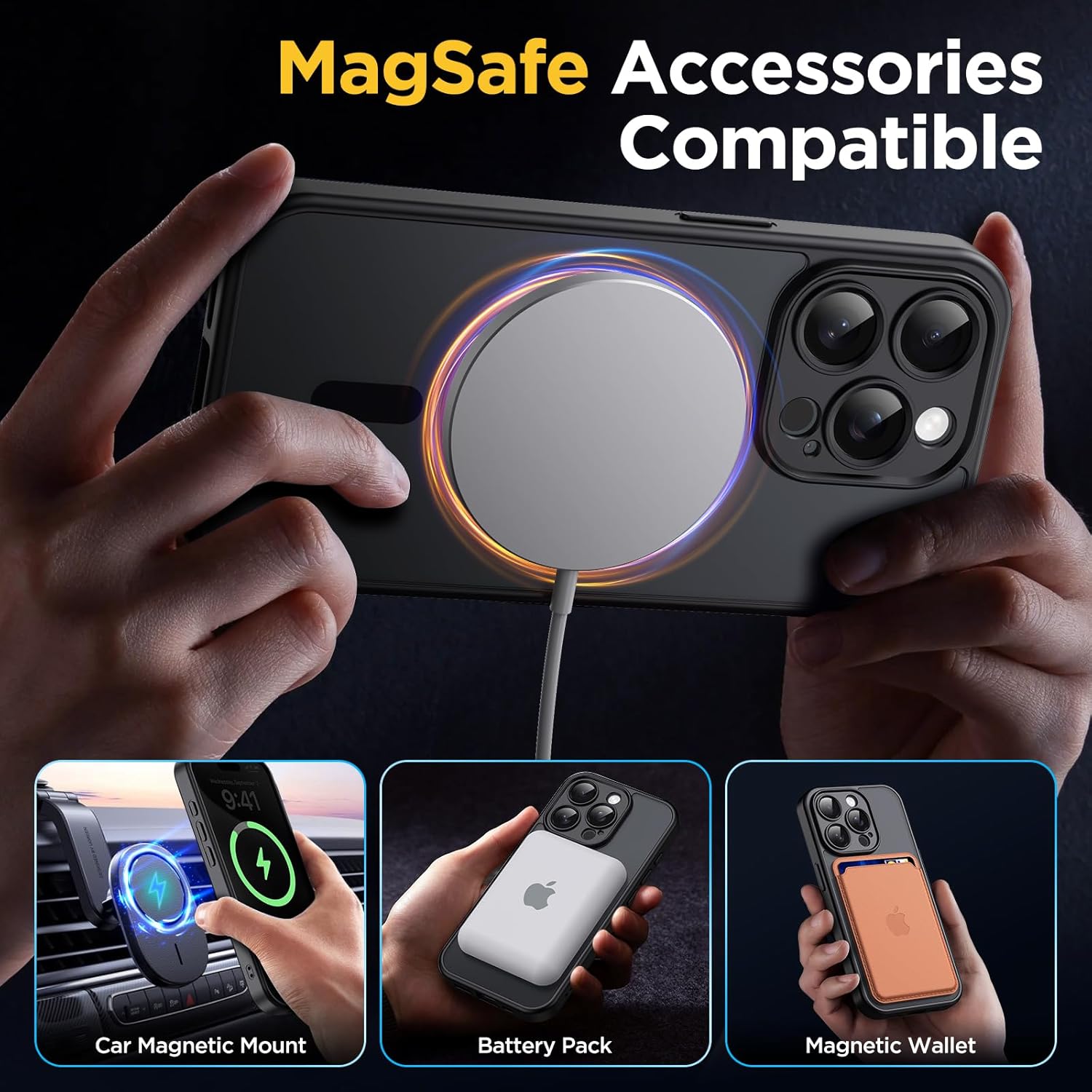 • Функция за магнитно засмукване: Мощният вграден магнит подобрява магнитната връзка и осигурява автоматично подравняване, като е съвместим с всички аксесоари MagSafe, като например магнитни зарядни устройства с вендуза, магнитни пакети с вендуза, магнитни държачи с вендуза и други. Независимо дали сте в ежедневието или пътувате, можете да се насладите на практичността, която калъфът носи със себе си.
