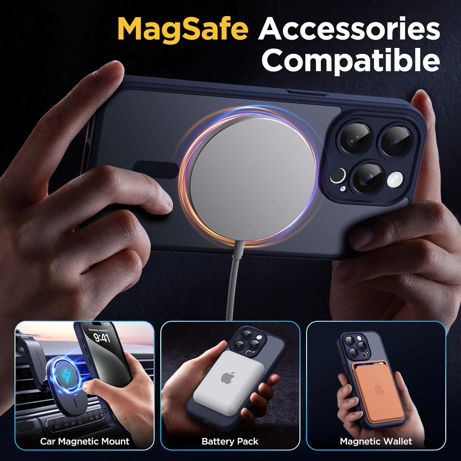 • Функция за магнитно засмукване: Мощният вграден магнит подобрява магнитната връзка и осигурява автоматично подравняване, като е съвместим с всички аксесоари MagSafe, като например магнитни зарядни устройства с вендуза, магнитни пакети с вендуза, магнитни държачи с вендуза и други. Независимо дали сте в ежедневието или пътувате, можете да се насладите на практичността, която калъфът носи със себе си.