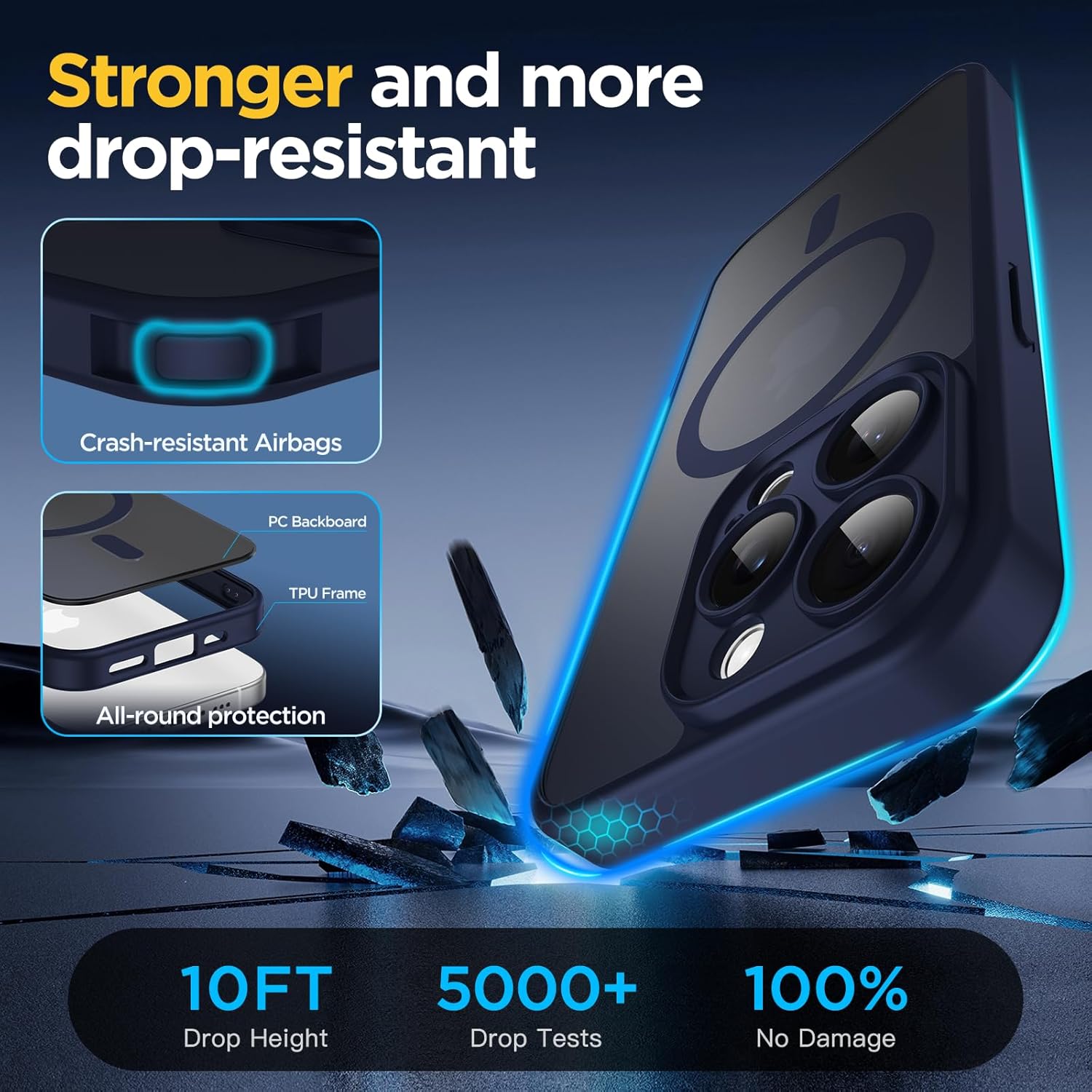 • [Военна защита от падане] Оборудвана с 4 удароустойчиви ъгъла на конструкцията и технология за 360° въздушни възглавници, подсилена с допълнително абсорбиране на удара. Ефективно абсорбира и разпределя силите на удара, като същевременно постига защита от военно ниво, като същевременно запазва лек и тънък профил.