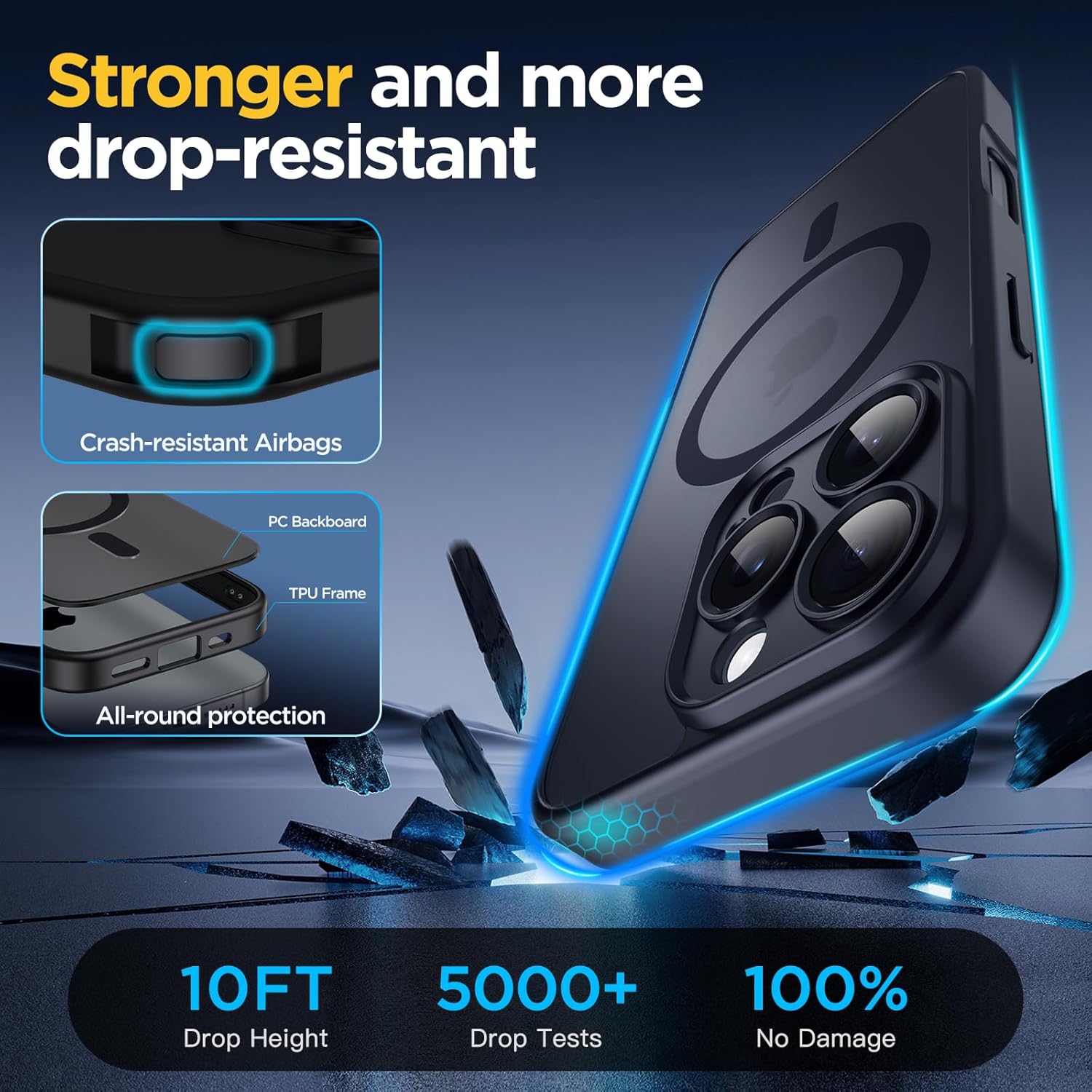 • [Военна защита от падане] Оборудвана с 4 удароустойчиви ъгъла на конструкцията и технология за 360° въздушни възглавници, подсилена с допълнително абсорбиране на удара. Ефективно абсорбира и разпределя силите на удара, като същевременно постига защита от военно ниво, като същевременно запазва лек и тънък профил.