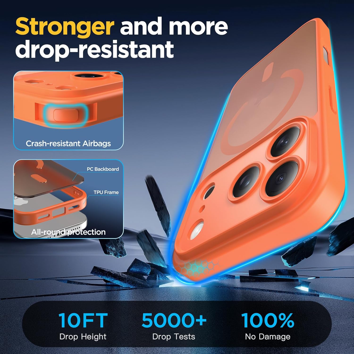 • [Военна защита от падане] Оборудвана с 4 удароустойчиви ъгъла на конструкцията и технология за 360° въздушни възглавници, подсилена с допълнително абсорбиране на удара. Ефективно абсорбира и разпределя силите на удара, като същевременно постига защита от военно ниво, като същевременно запазва лек и тънък профил.
