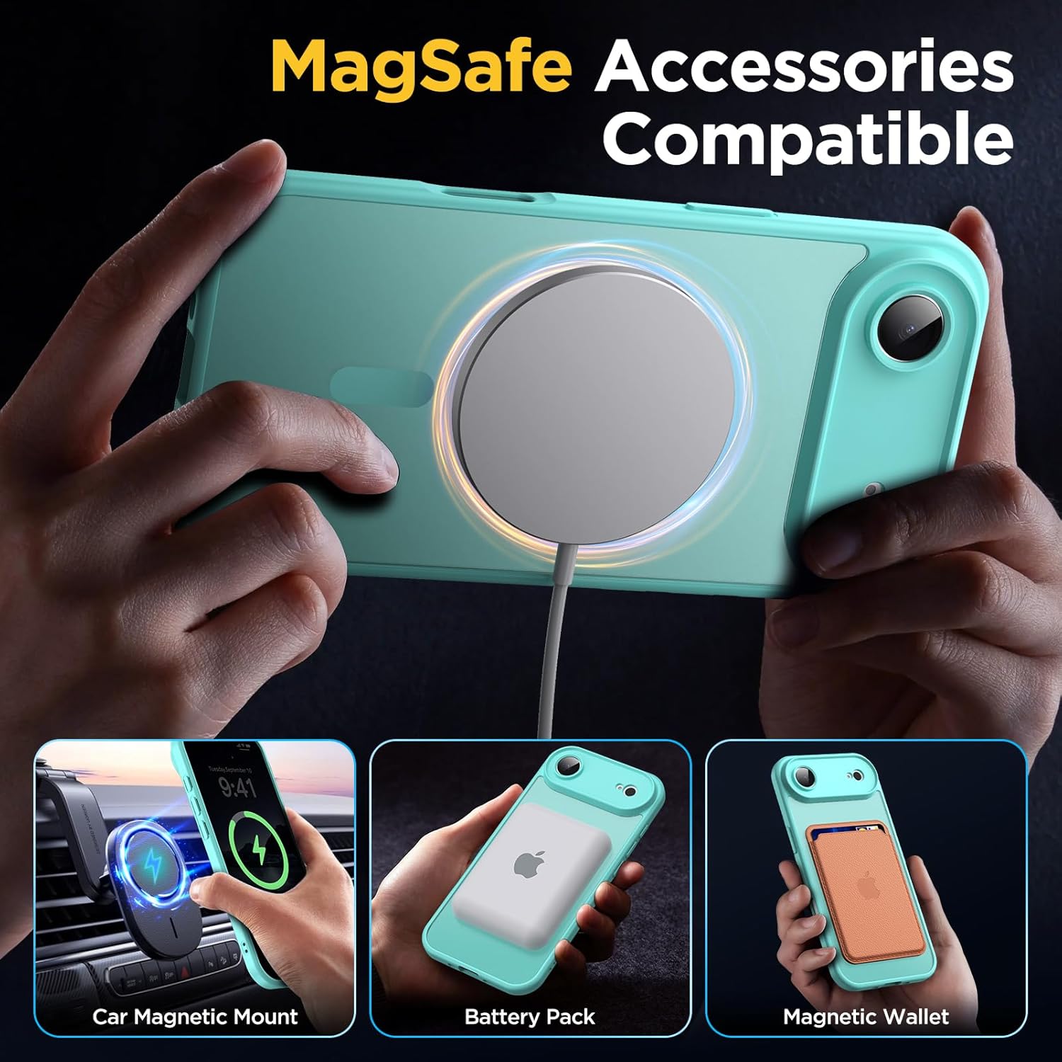 • Функция за магнитно засмукване: Мощният вграден магнит подобрява магнитната връзка и осигурява автоматично подравняване, като е съвместим с всички аксесоари MagSafe, като например магнитни зарядни устройства с вендуза, магнитни пакети с вендуза, магнитни държачи с вендуза и други. Независимо дали сте в ежедневието или пътувате, можете да се насладите на практичността, която калъфът носи със себе си.