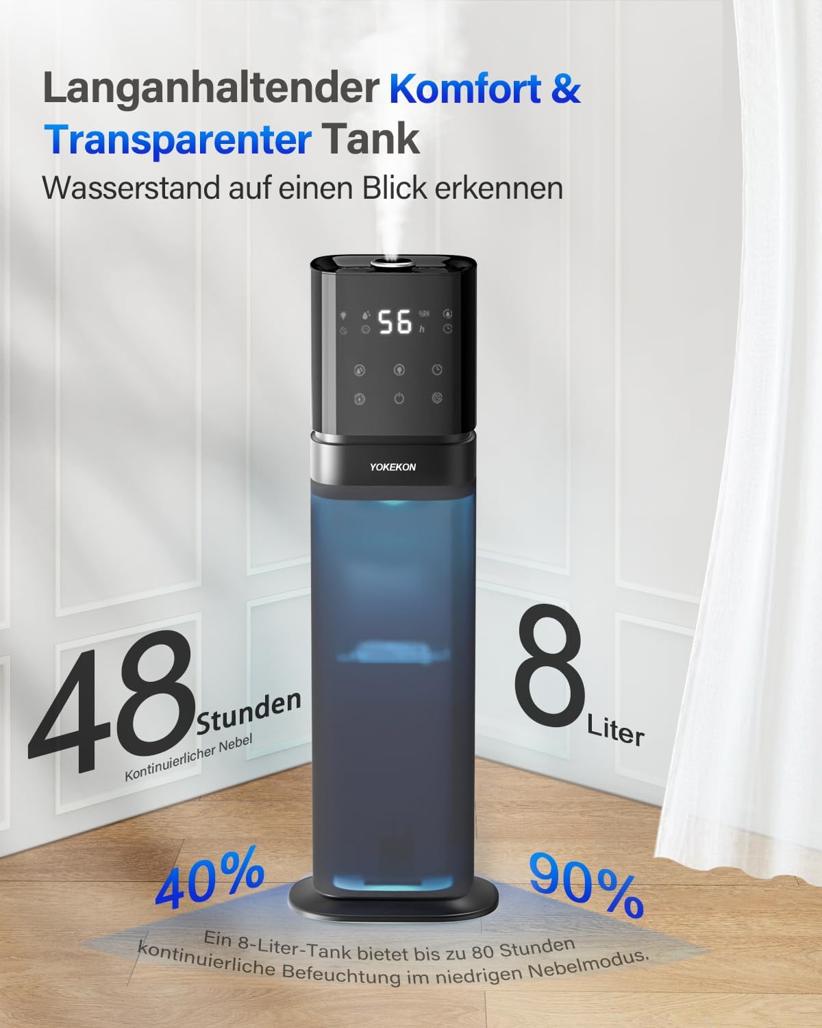• 【Голям капацитет и херметична конструкция с пълнене отгоре】Овлажнителят с подвижен капацитет от 8 литра и пълнене отгоре, херметична конструкция, решава проблема с течовете и позволява лесно пълнене. С едно пълнене може да работи непрекъснато до 80 часа без често пълнене. Благодарение на високото отделяне на влага от 300 мл/ч, той овлажнява помещения с площ до 93 квадратни метра и ефективно облекчава сухия въздух и сухата кожа.