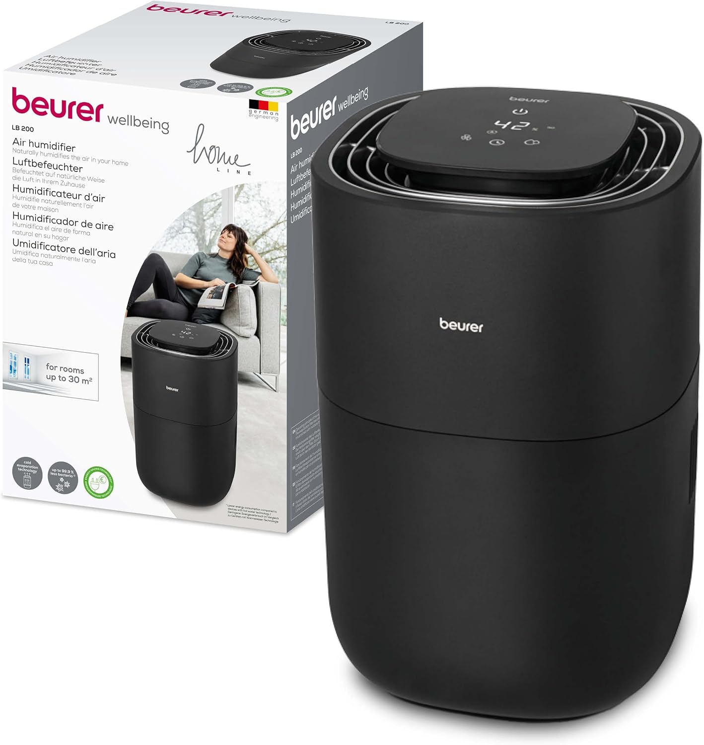 Овлажнител Beurer LB 200 с енергийно ефективна технология за студено изпаряване, хигиенично постоянно овлажняване на въздуха, с функция за изсушаване на филтъра, 3 нива на овлажняване, за помещения до приблизително...