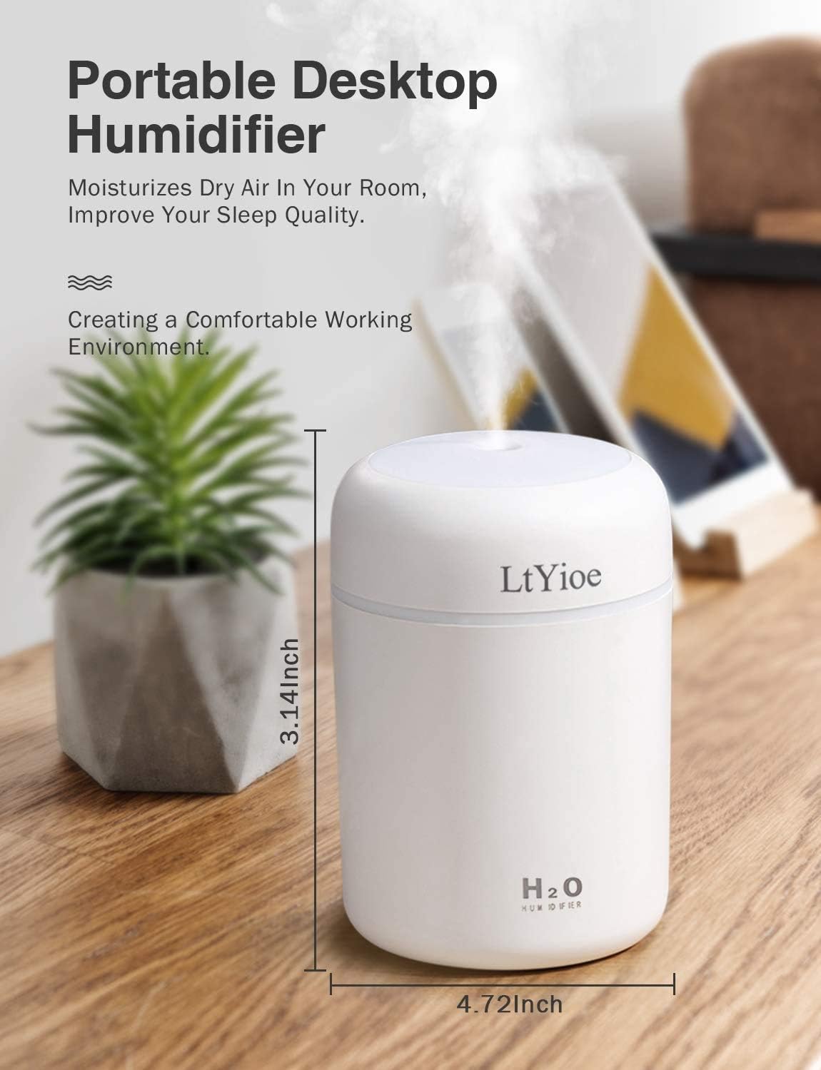 • Преносим мини овлажнител и USB захранване: преносимият и малък дизайн е много опростен, така че можете да го вземете навсякъде. USB захранването е съвместимо с всеки USB порт, което гарантира, че може да се използва в спалнята, офиса и колата.