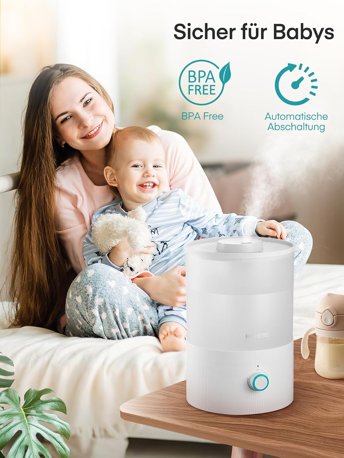 • БЕЗОПАСЕН И ТИХ Този овлажнител е идеален за бебешки стаи, тъй като е изработен от материал без BPA и има функция за автоматично изключване. Благодарение на тихата работа и приятния въздух, вашето бебе спи спокойно.