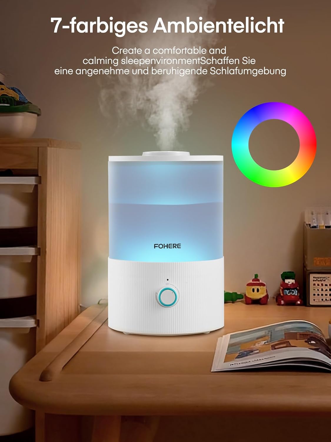 Овлажнител за спалня FOHERE, 3,2 л тих бебешки овлажнител с горно пълнене, 28 часа, 360° хладна мъгла, без BPA, арома дифузер, 7 цвята, нощна светлина за растения, за дома, офиса