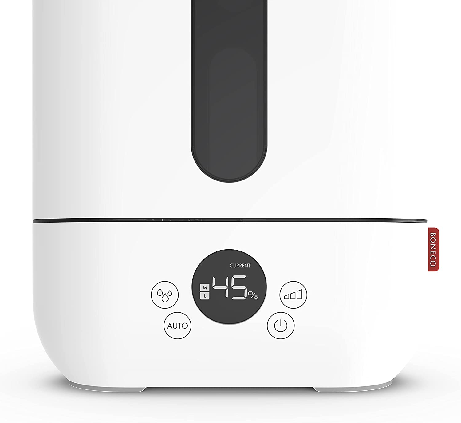 • Благодарение на допълнителната интеграция на хигро сензора и добавения дисплей, BONECO U250 сега е невероятно лесен за работа. Дисплеят дава на потребителя преглед на всички функции и информация за поддръжка. Благодарение на вградения хигро сензор са интегрирани няколко нови функции. Например режимът "AUTO" осигурява автоматично и безгрижно овлажняване на въздуха в помещението при оптимално ниво на относителна влажност от 50%. Дисплеят позволява тази стойност да се регулира лесно и интуитивно. Освен това на дисплея може да се показва информация за поддръжка, като например необходимото почистване на уреда.