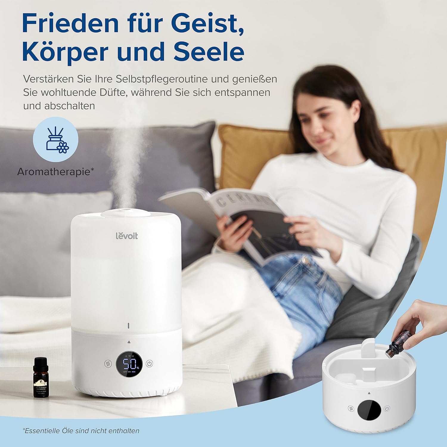 • Лесен за употреба: С едва 19 dB, овлажнителят работи особено тихо. Благодарение на времето за работа до 25 часа, едно пълнене е достатъчно, за да можете да спите спокойно цяла нощ в спалнята и детската стая.