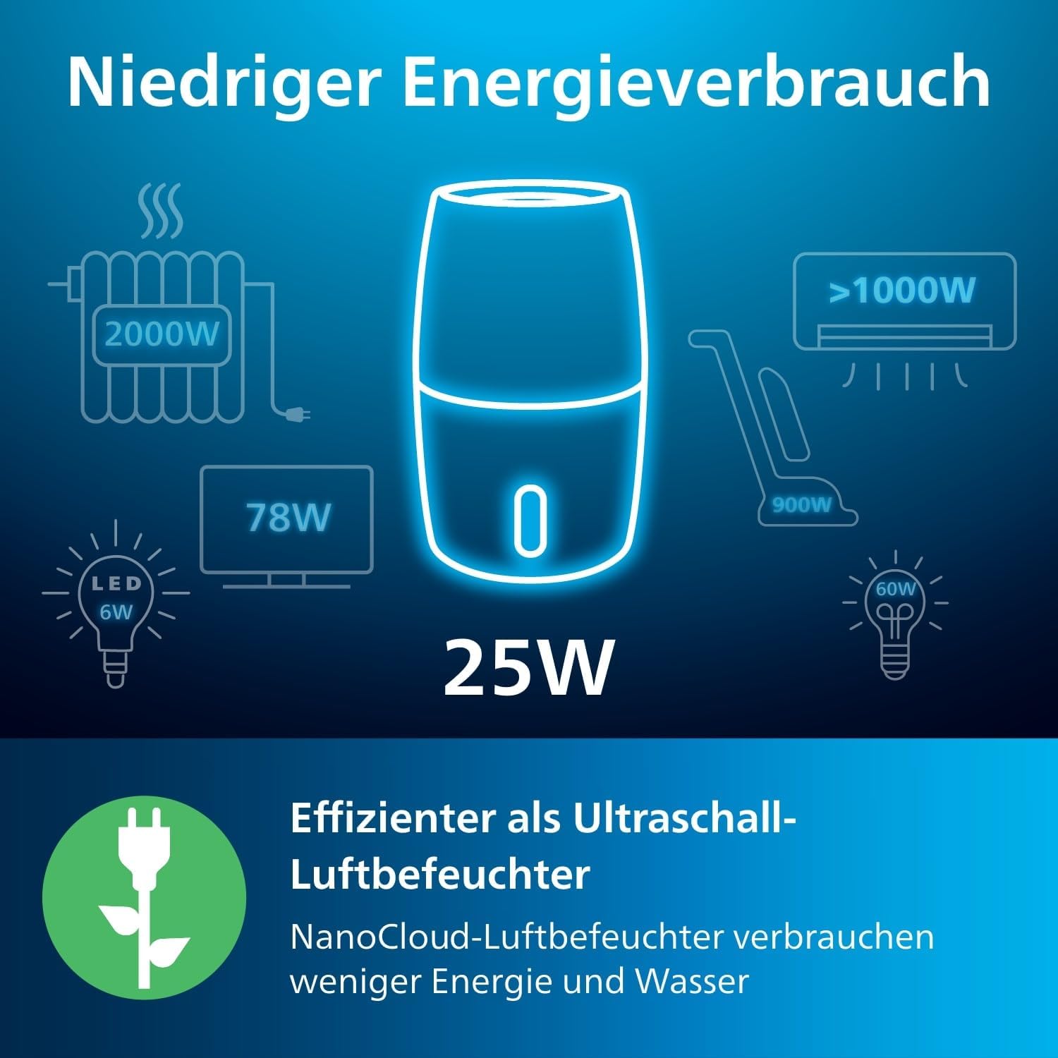 NanoCloud Technologie wendet einen natürlichen Verdunstungsprozess an, der weithin als hygienisch sichere und effektive Methode der Befeuchtung bekannt ist. Es werden keine Ionen, Chemikalien oder Ozon verwendet*** und es wird kein Wasser erhitzt, so dass kein Verbrennungsrisiko besteht.
