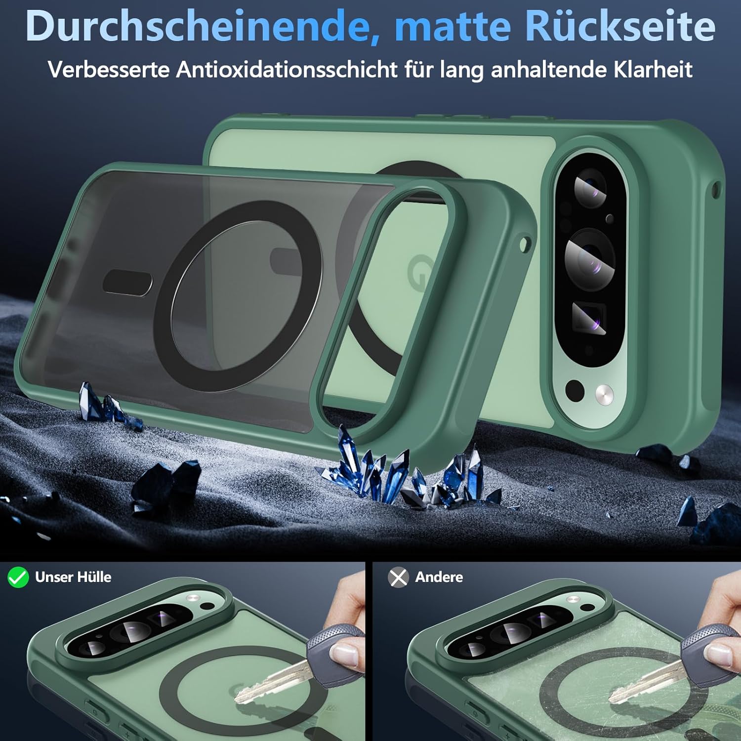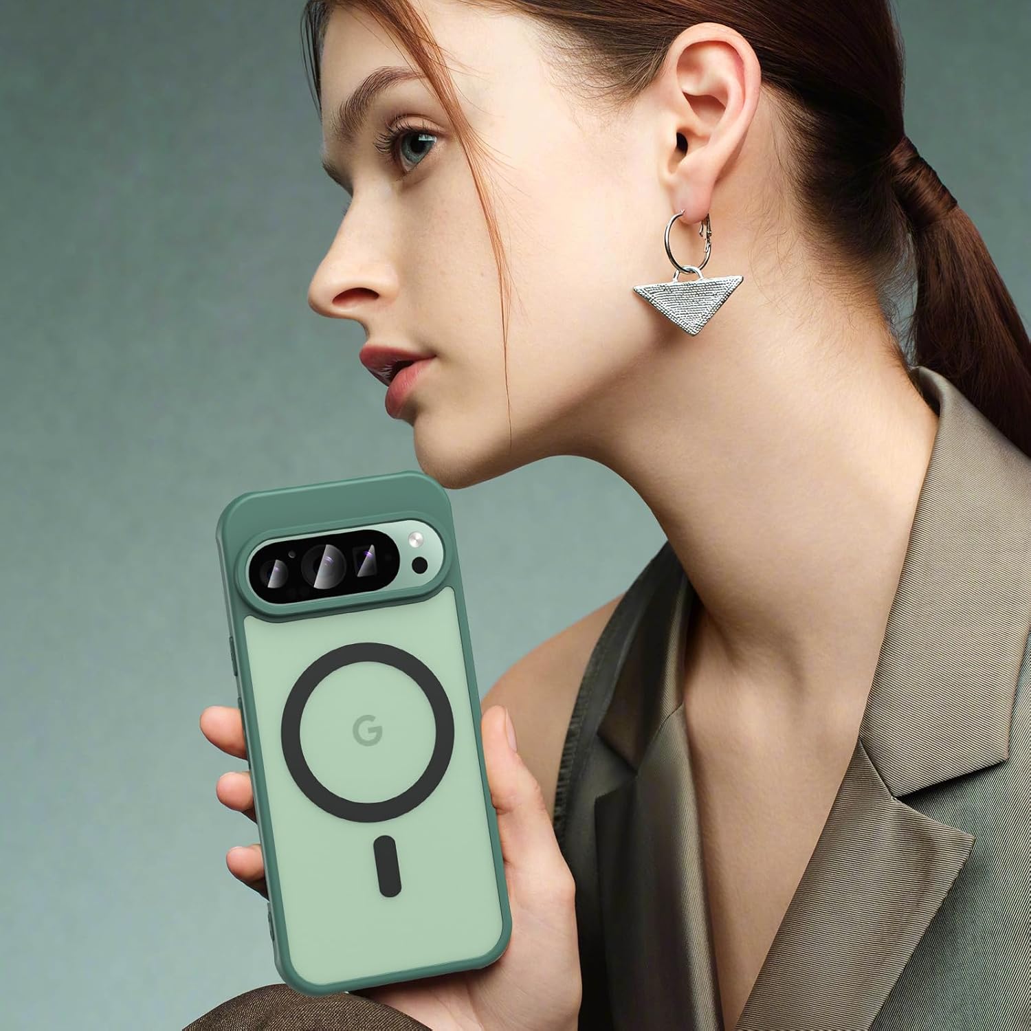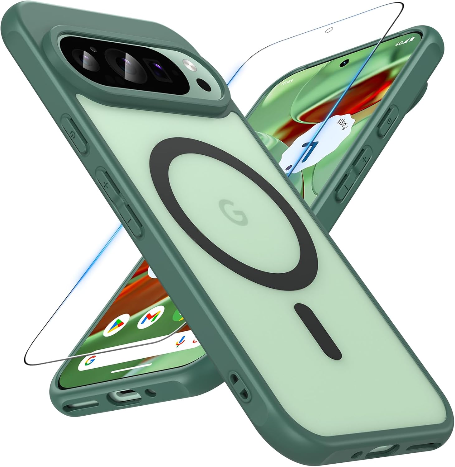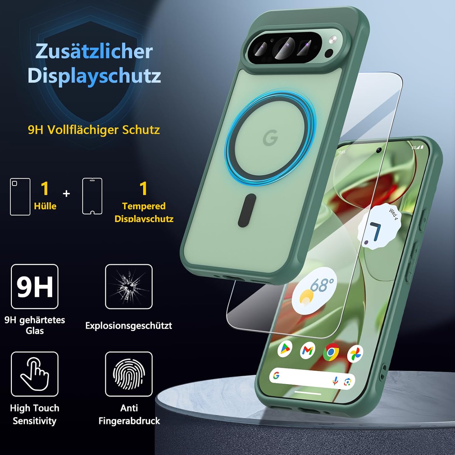 OWKEY Калъф за Google Pixel 9 Pro, Магнитен със закалено стъкло, Удароустойчив защитен калъф за Magsafe, Зелен