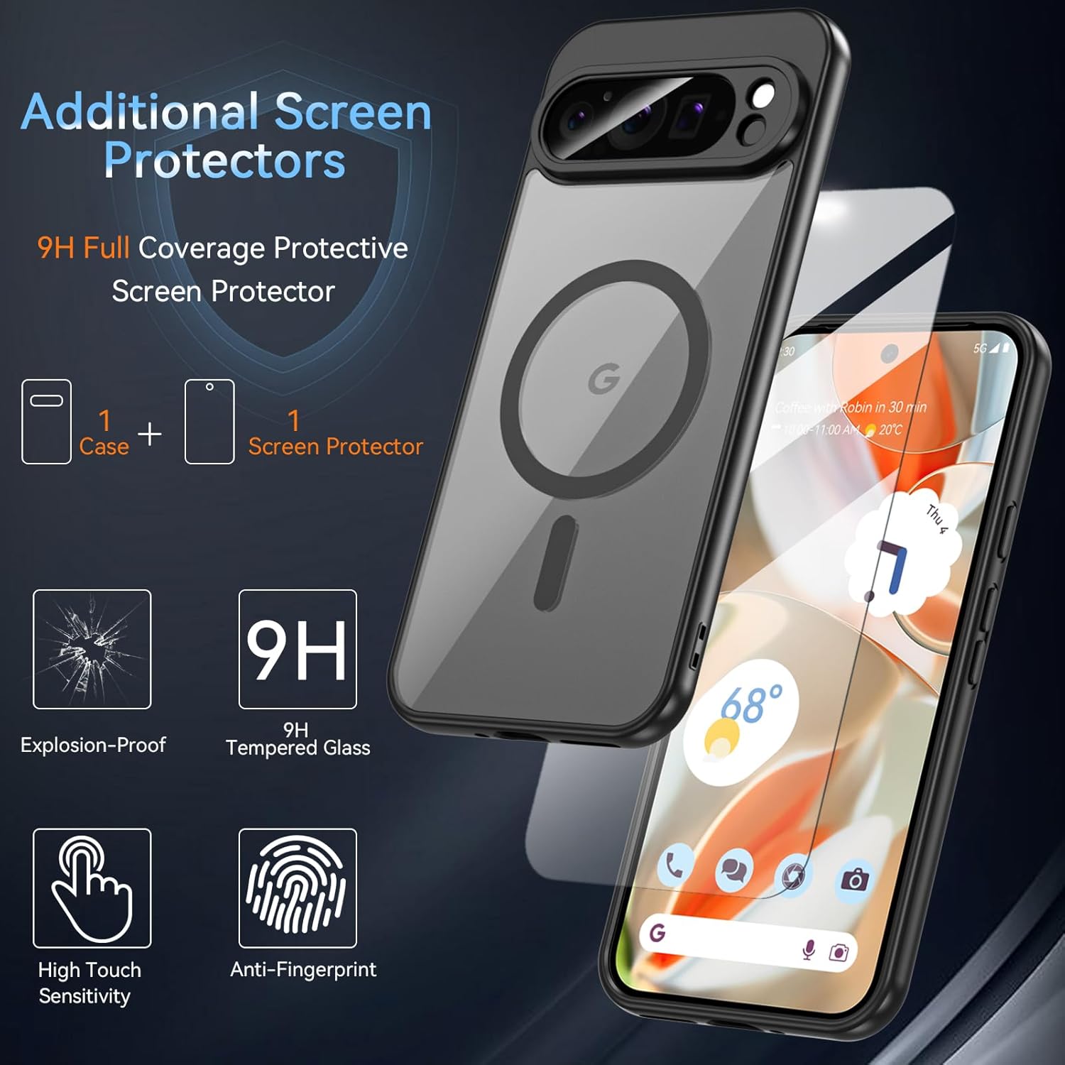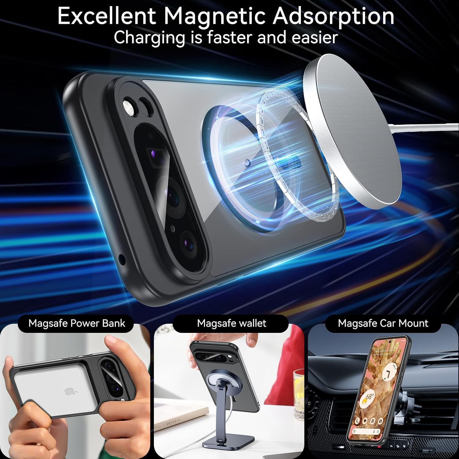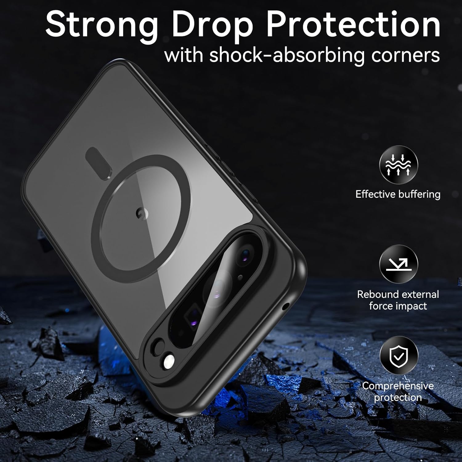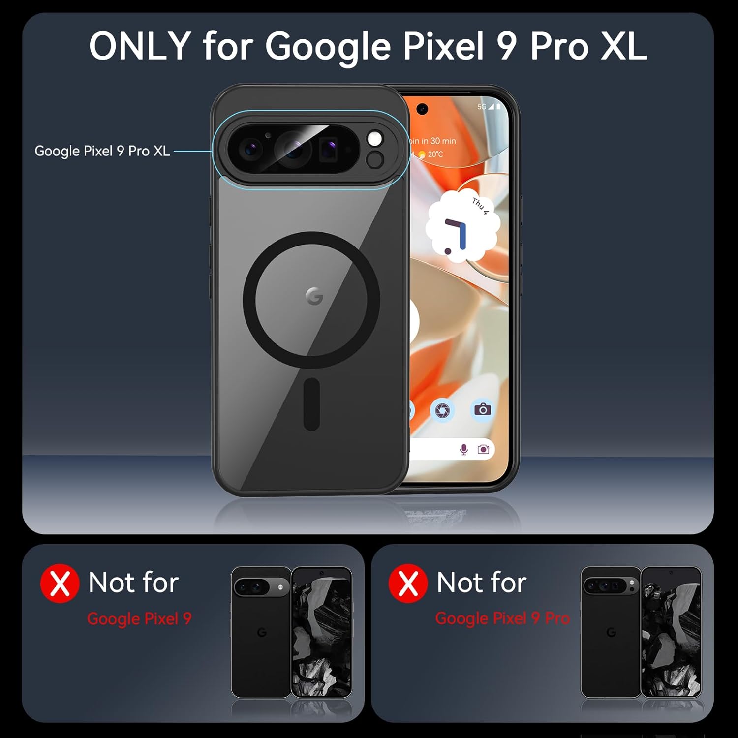 OWKEY Калъф за Google Pixel 9 Pro XL, Магнитен калъф за мобилен телефон за MagSafe със защитно стъкло, тънък военен защитен калъф (черен)