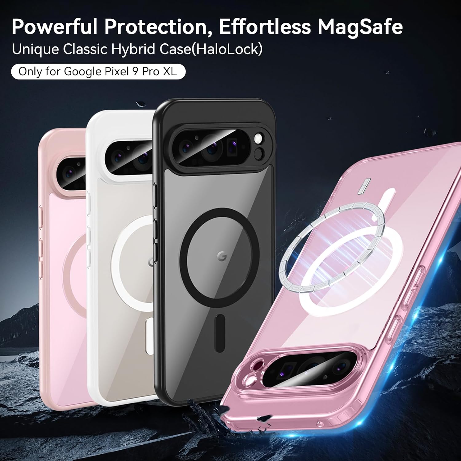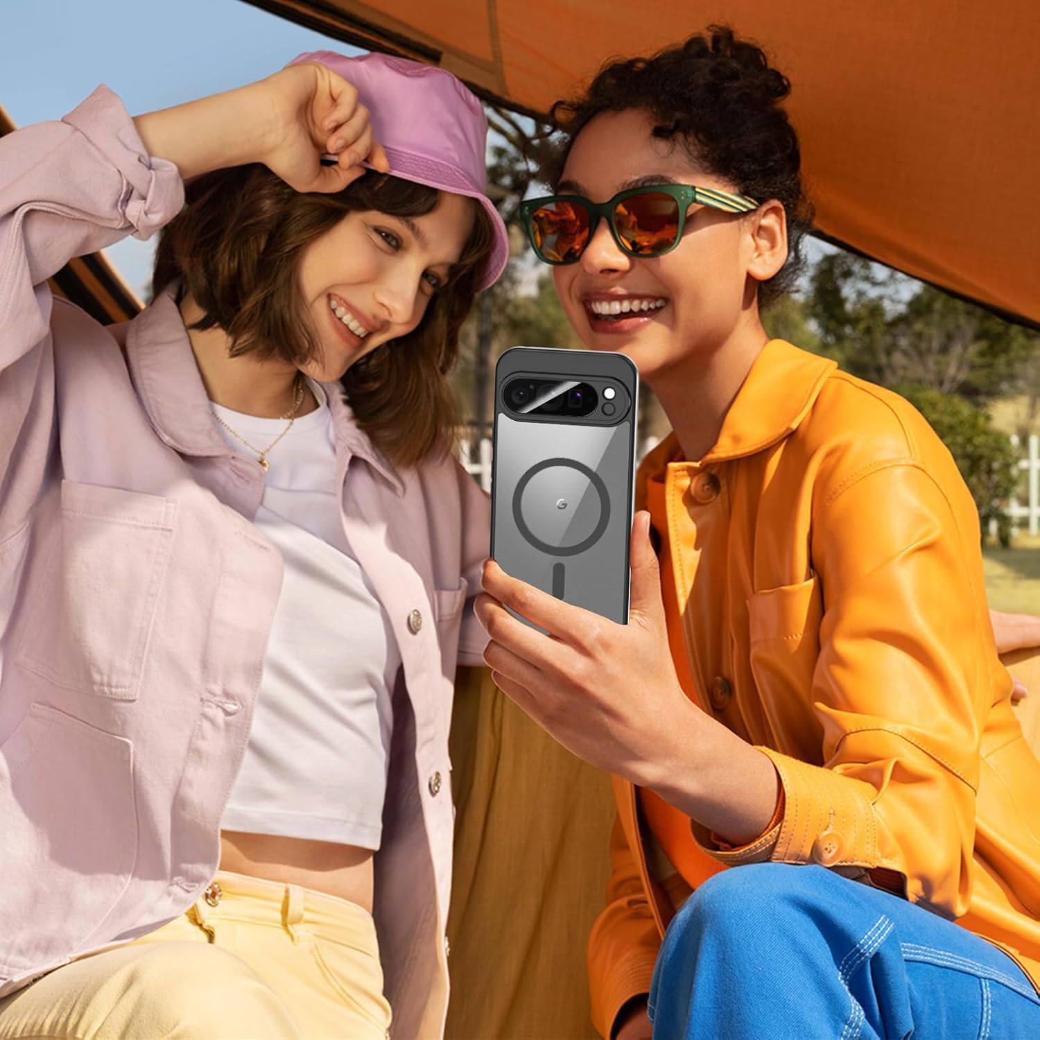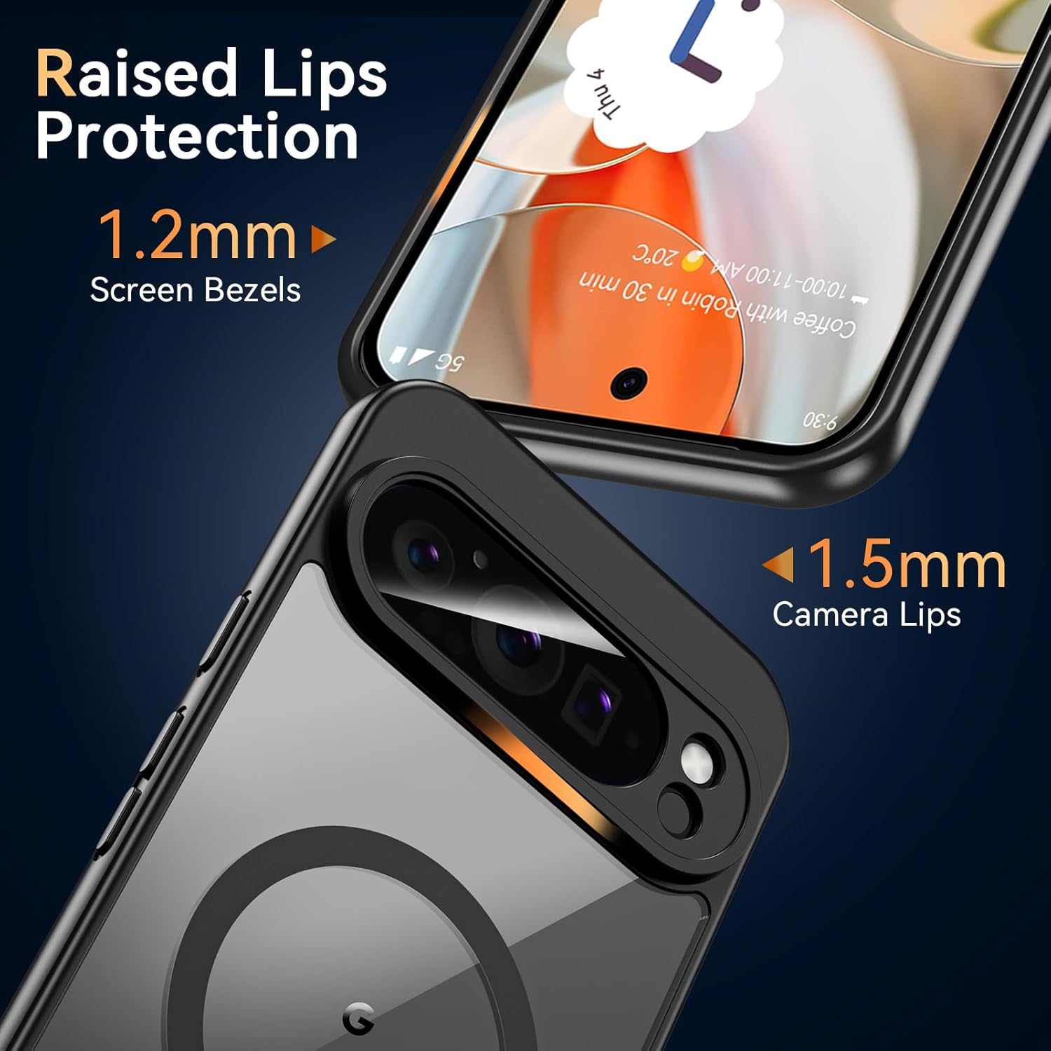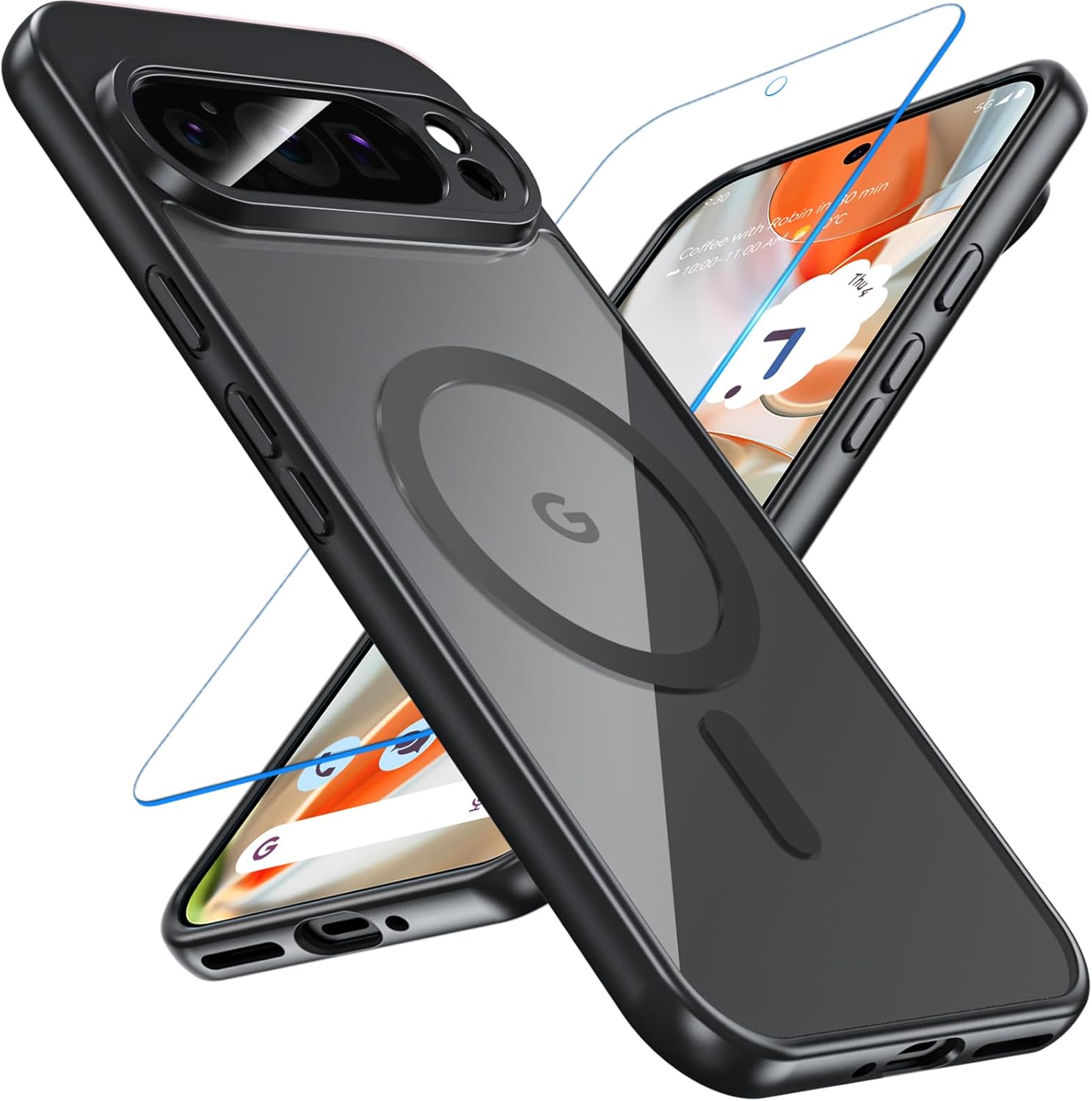 OWKEY Калъф за Google Pixel 9 Pro XL, Магнитен калъф за мобилен телефон за MagSafe със защитно стъкло, тънък военен защитен калъф (черен)