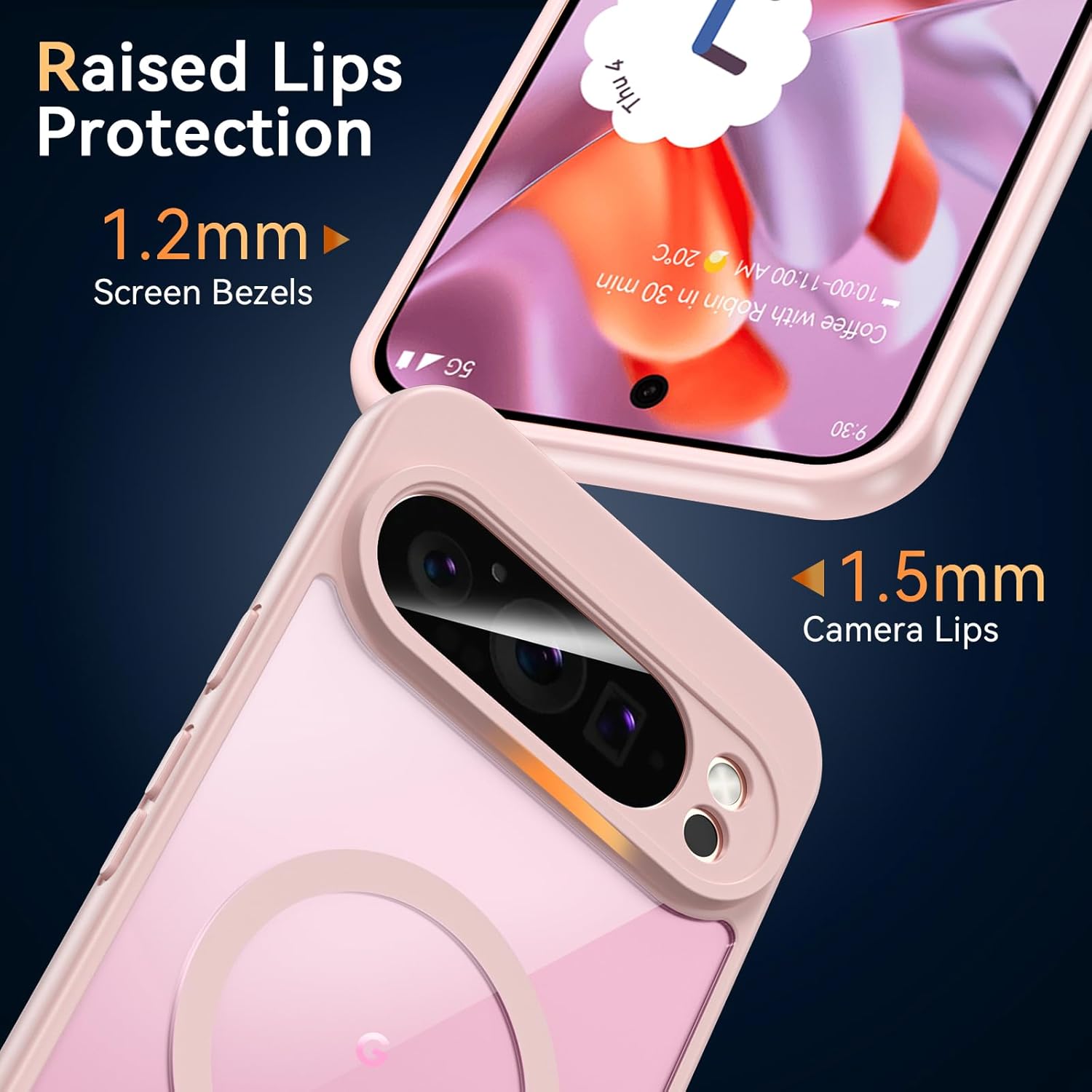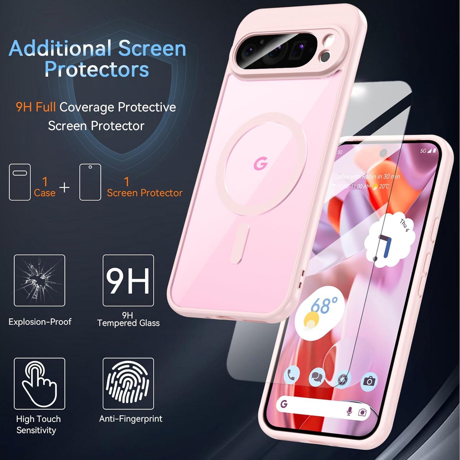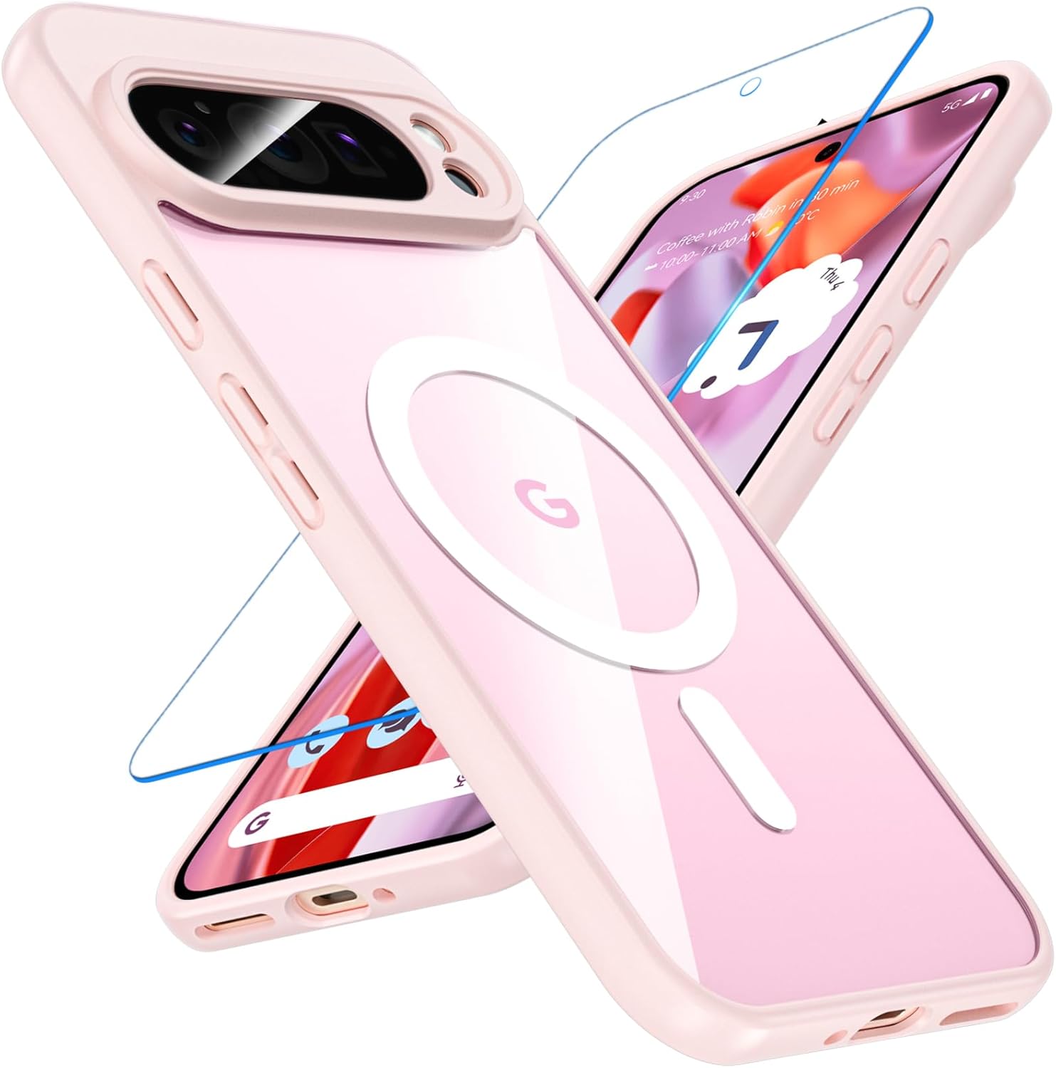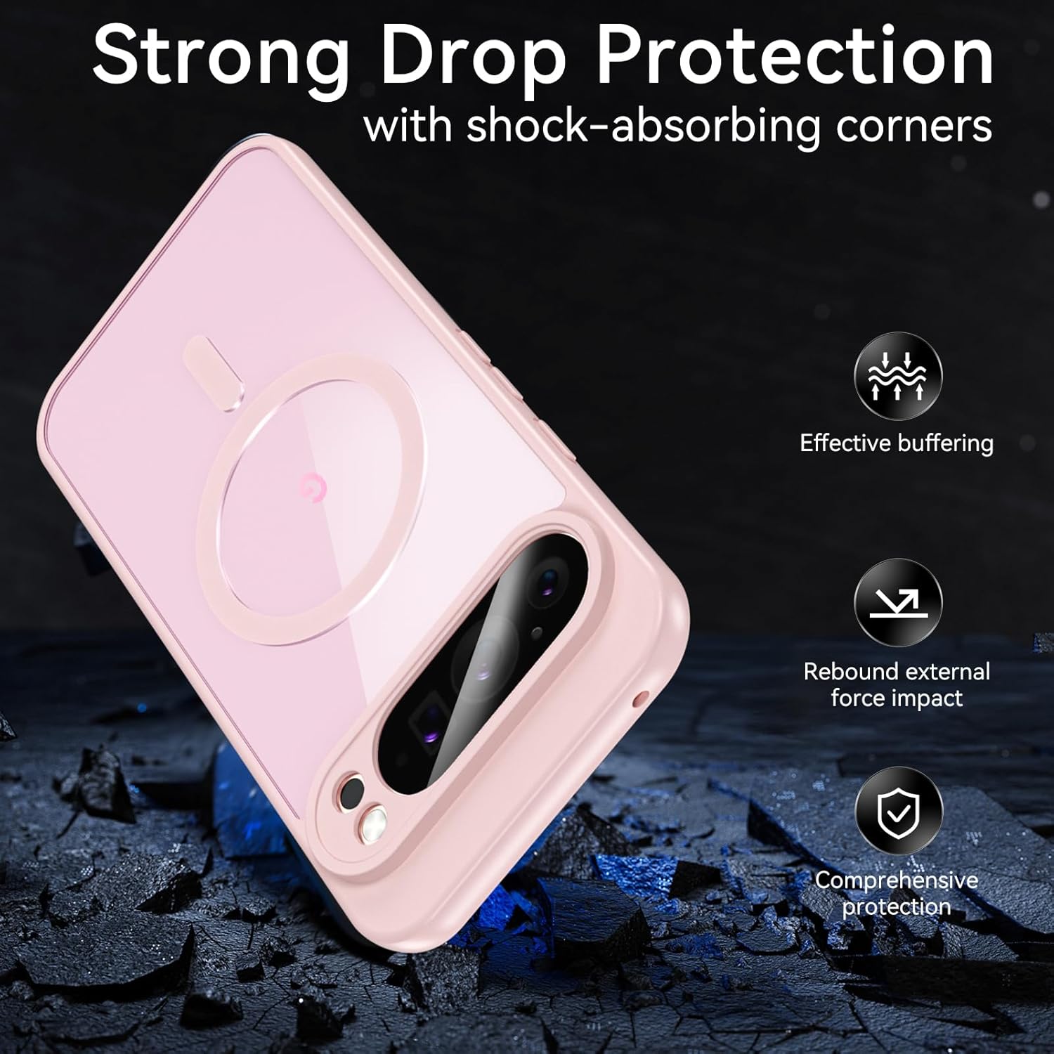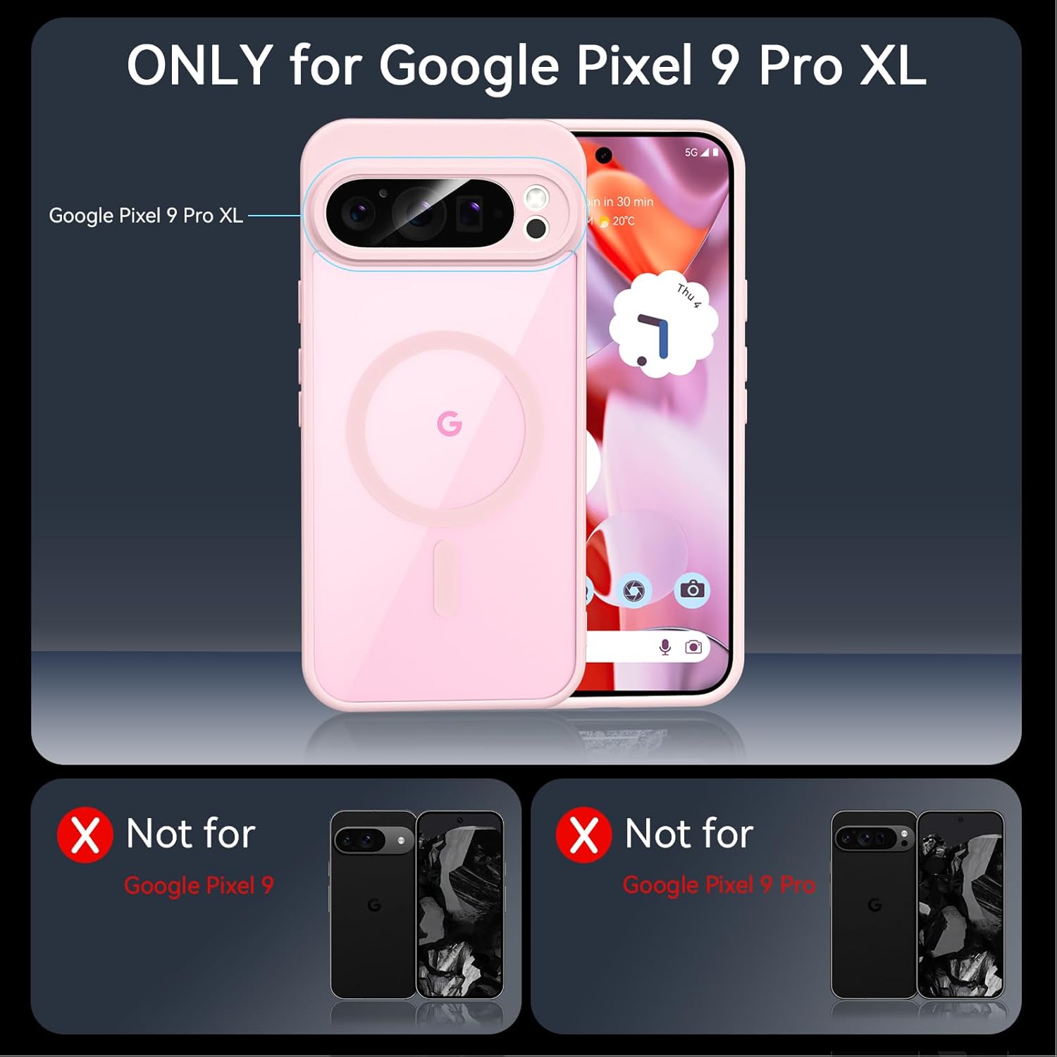OWKEY Калъф за Google Pixel 9 Pro XL, Магнитен калъф за мобилен телефон за MagSafe със защитно стъкло, тънък военен защитен калъф (розов)