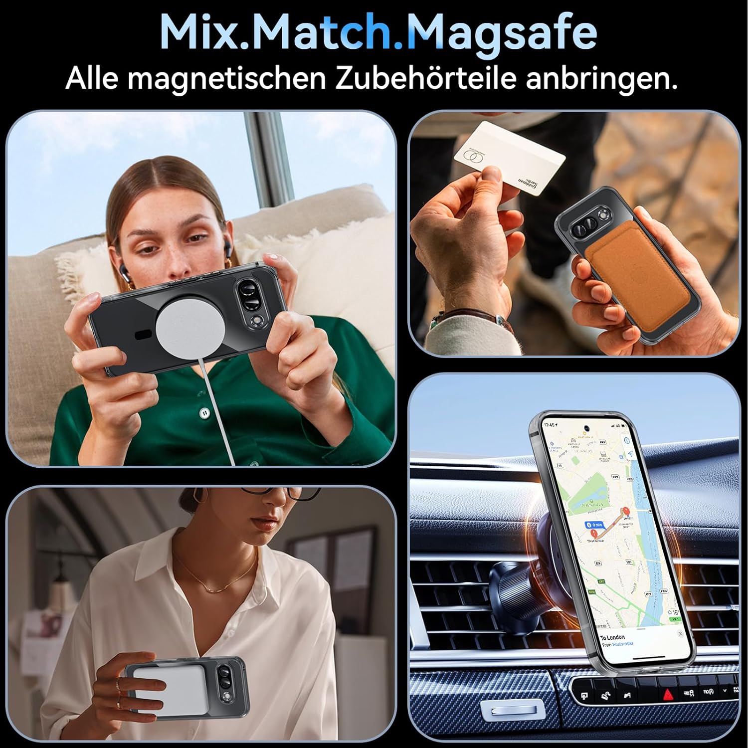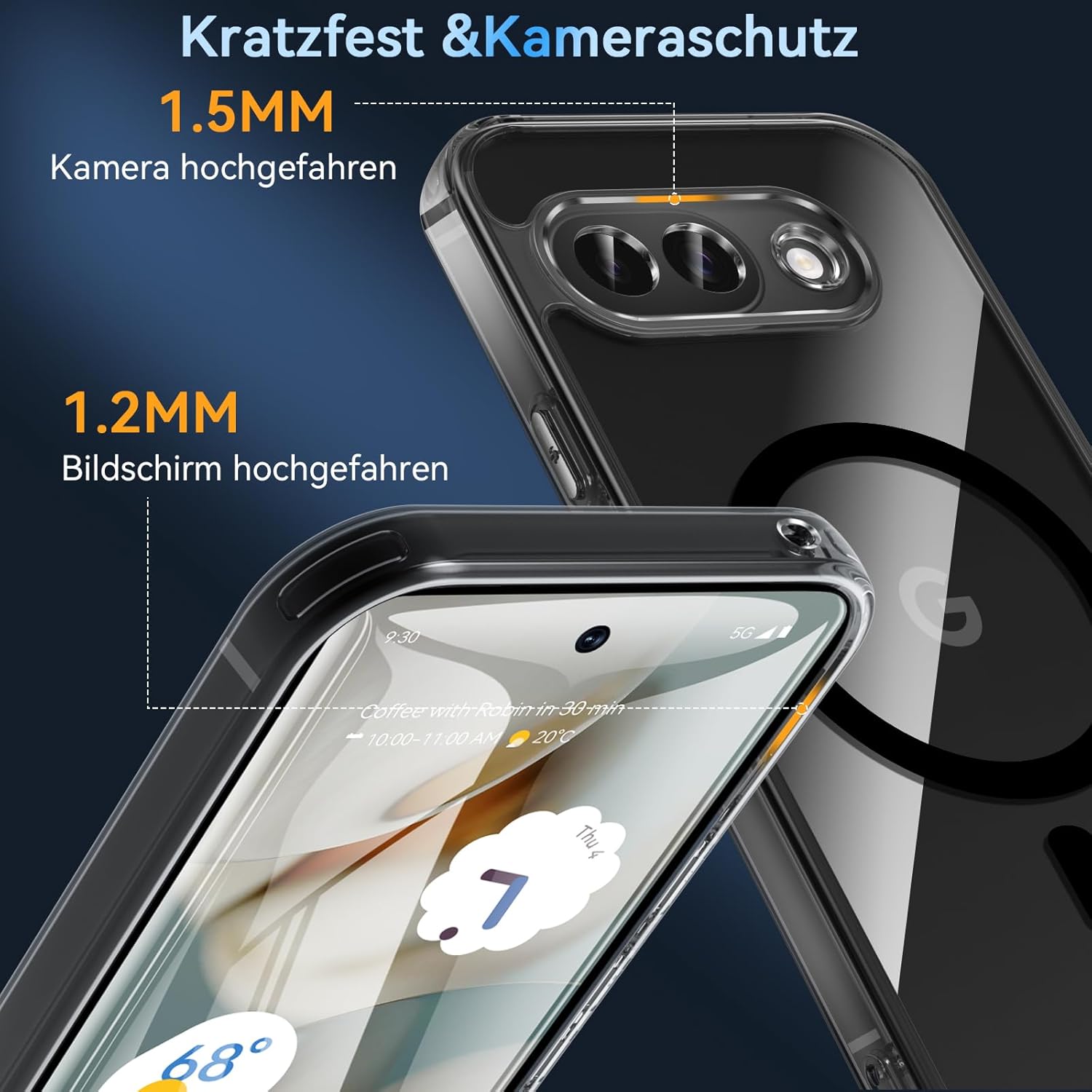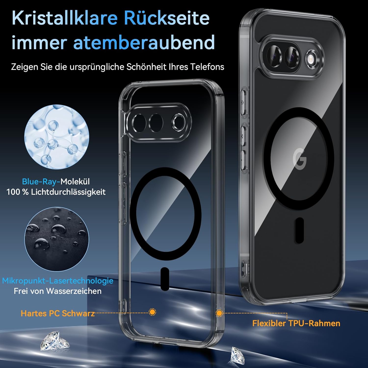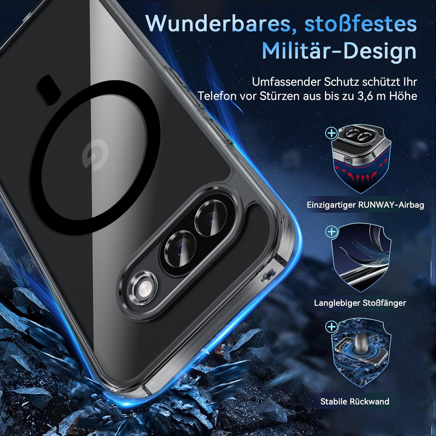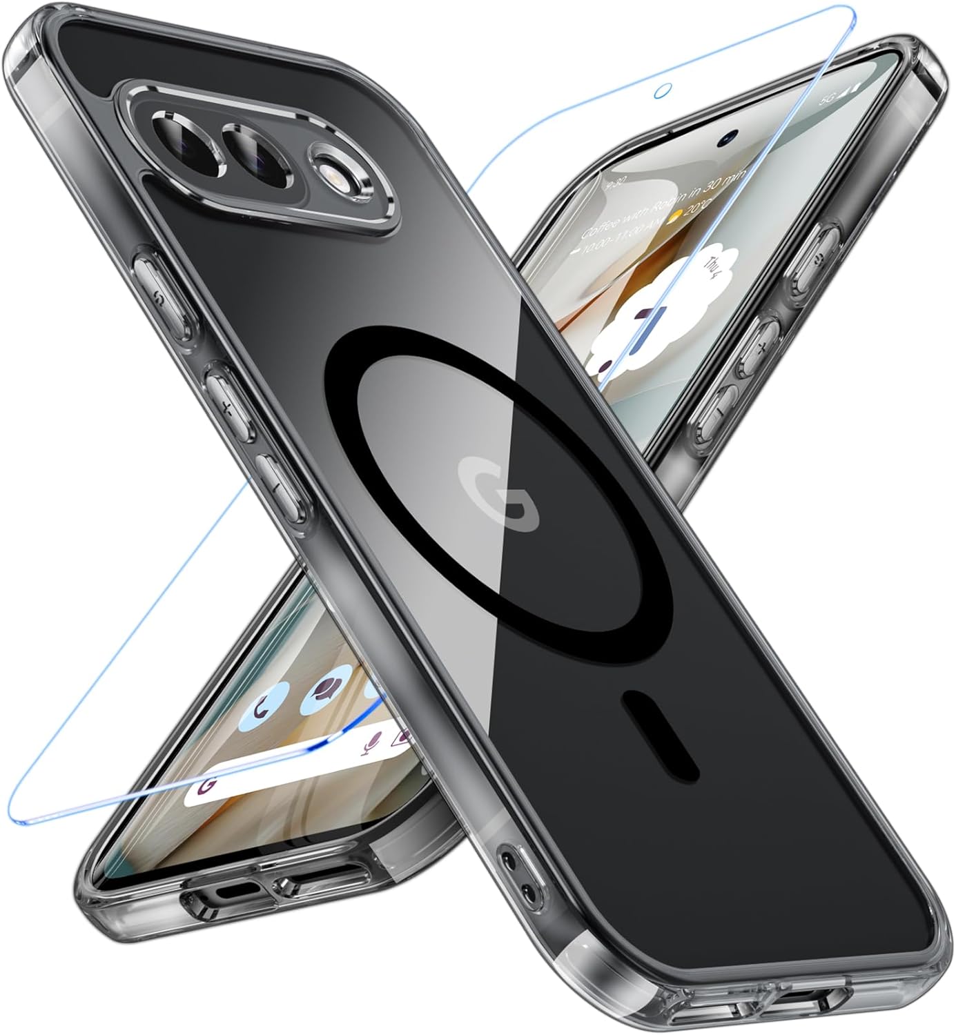 OWKEY Калъф за Google Pixel 9A, Магнитен калъф за мобилен телефон за MagSafe със защитно стъкло, тънък военен защитен калъф за Google Pixel 9A (черен)