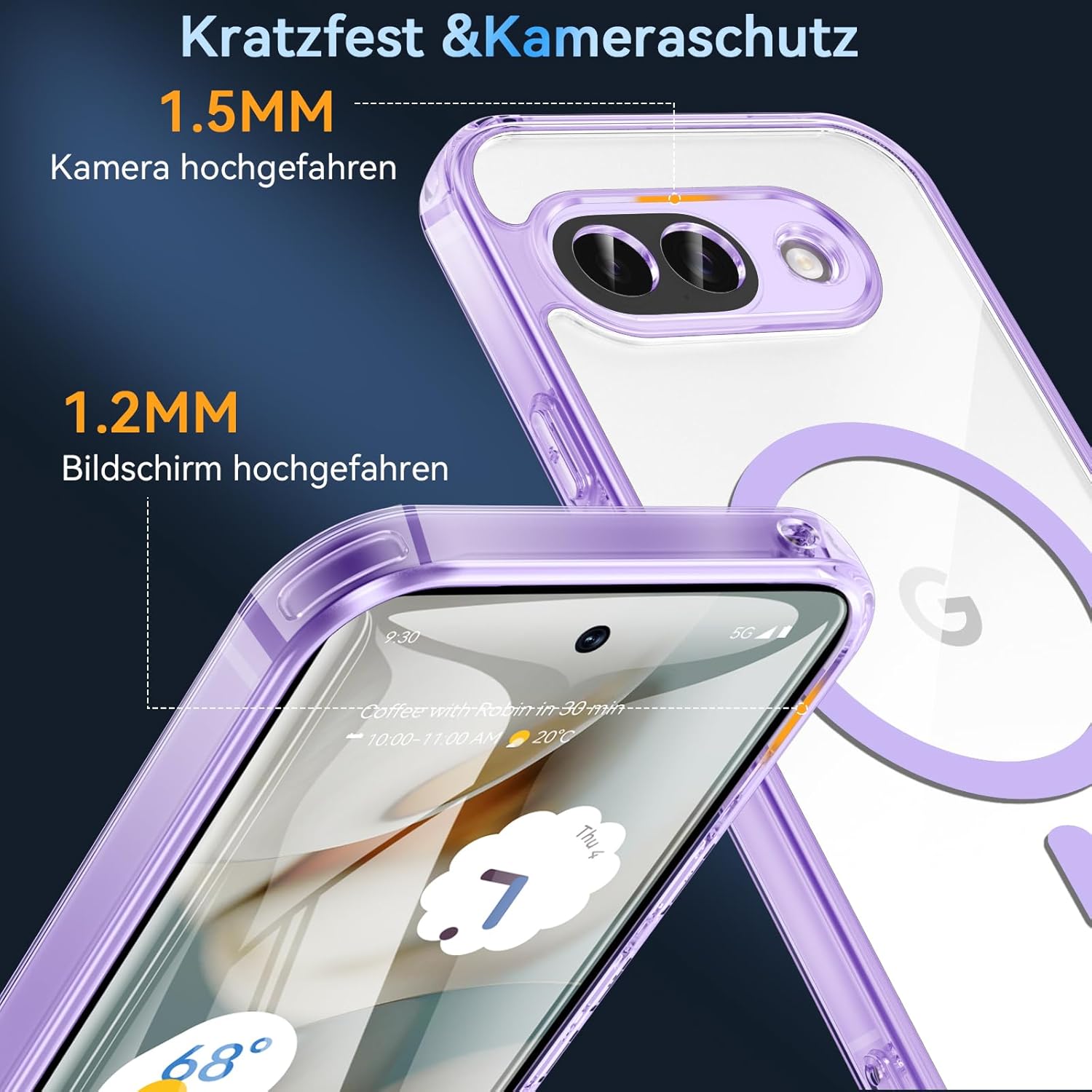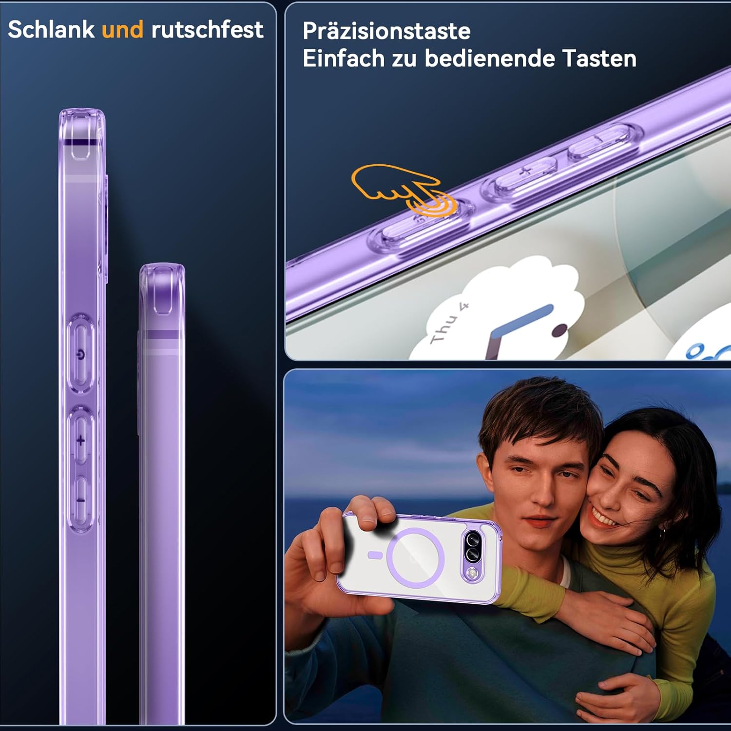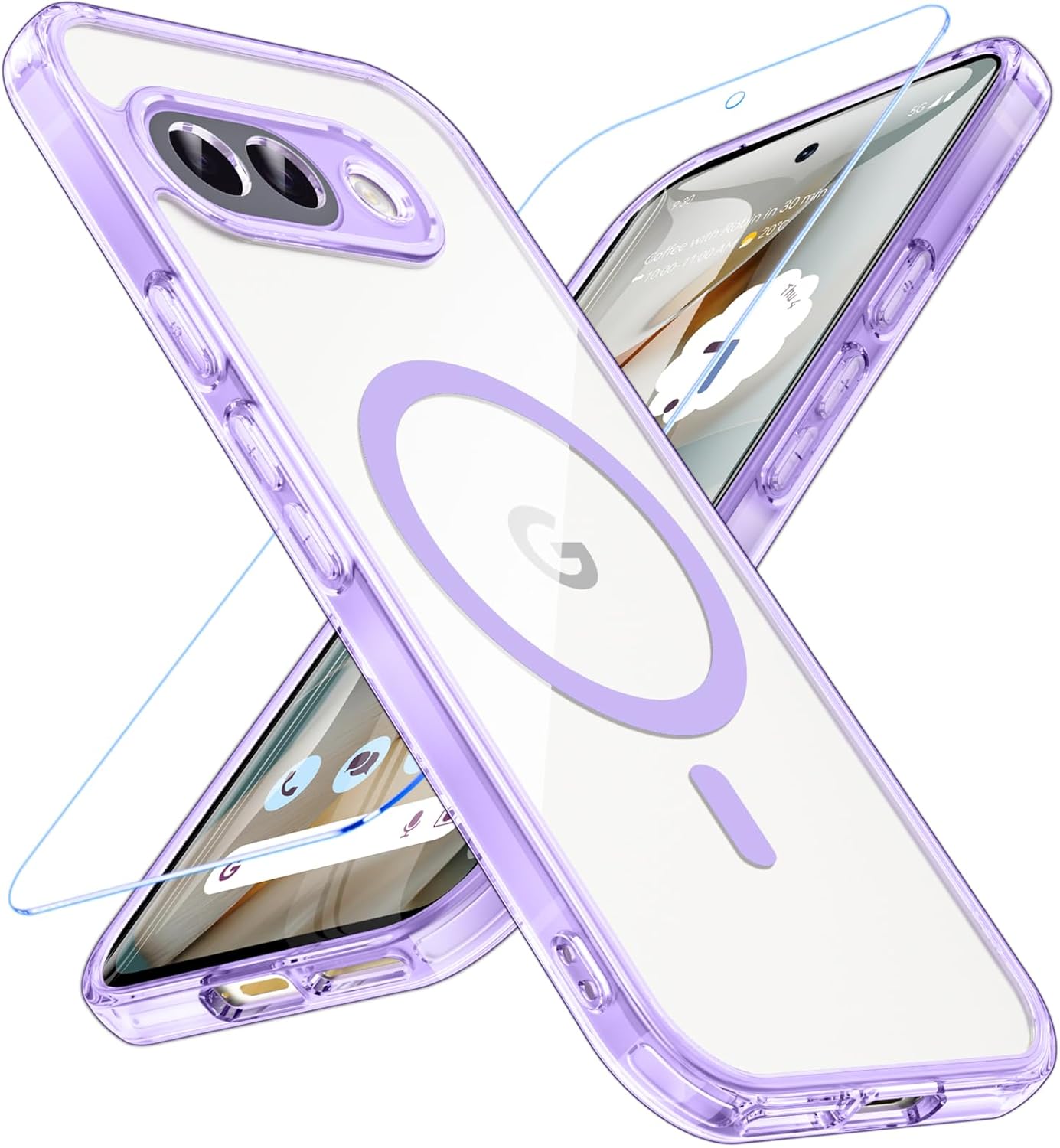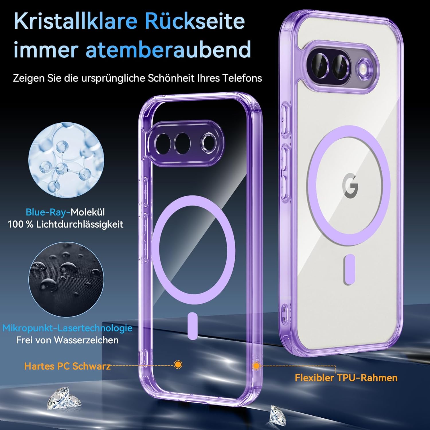 OWKEY Калъф за Google Pixel 9A, Магнитен калъф за мобилен телефон за MagSafe със защитно стъкло, тънък военен защитен калъф за Google Pixel 9A (лилав)